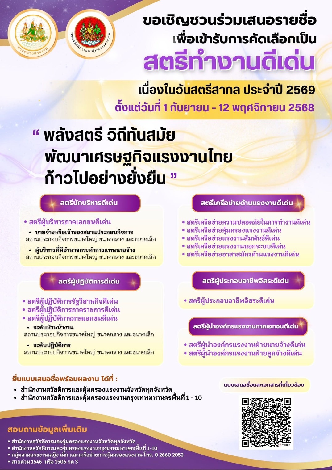 ขอความร่วมมือประชาสัมพันธ์และร่วมเสนอทำงานเพื่อเข้ารับการคัดเลือกเป็นสตรีทำงานดีเด่นประจำปี ๒๕๖๙
