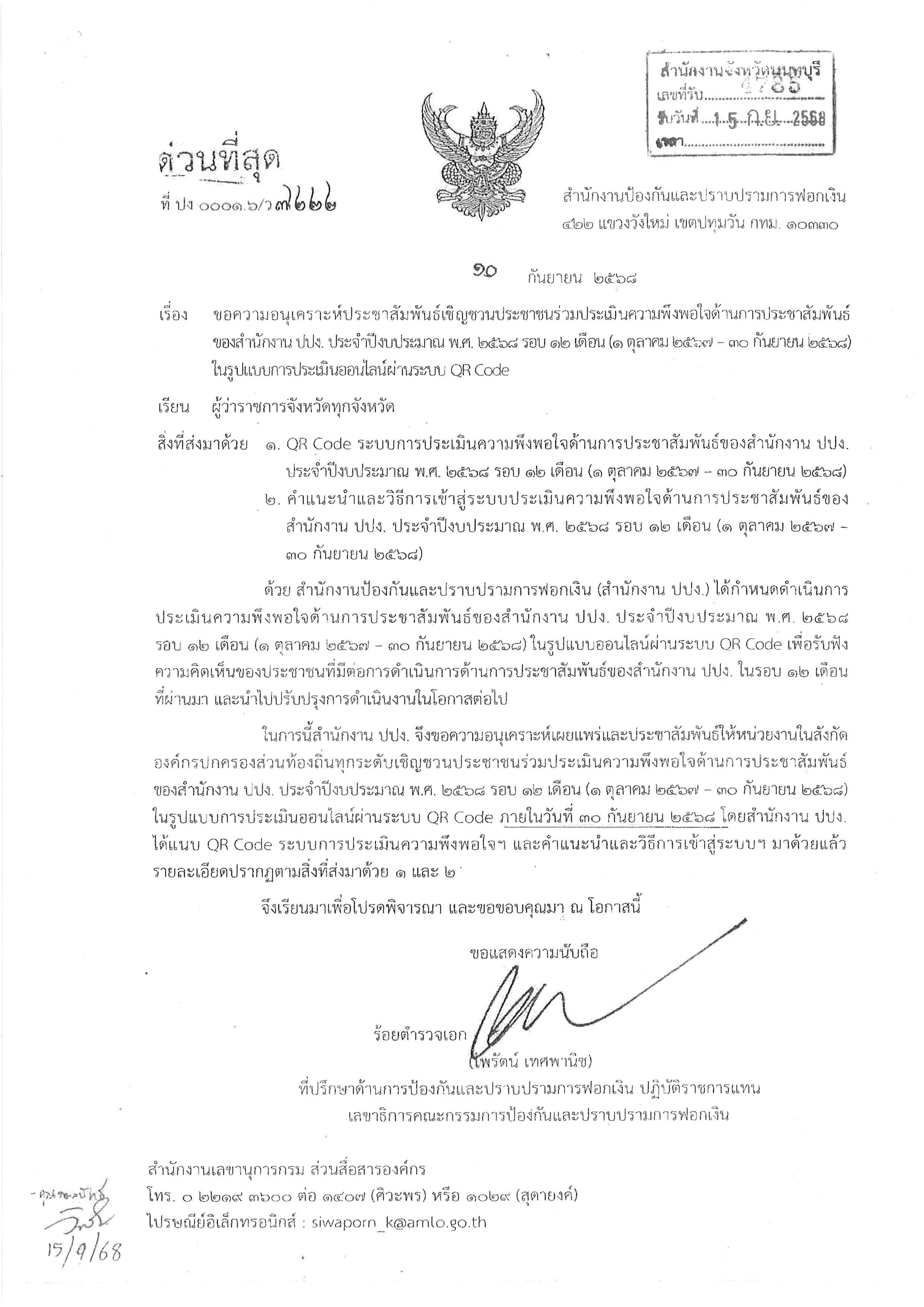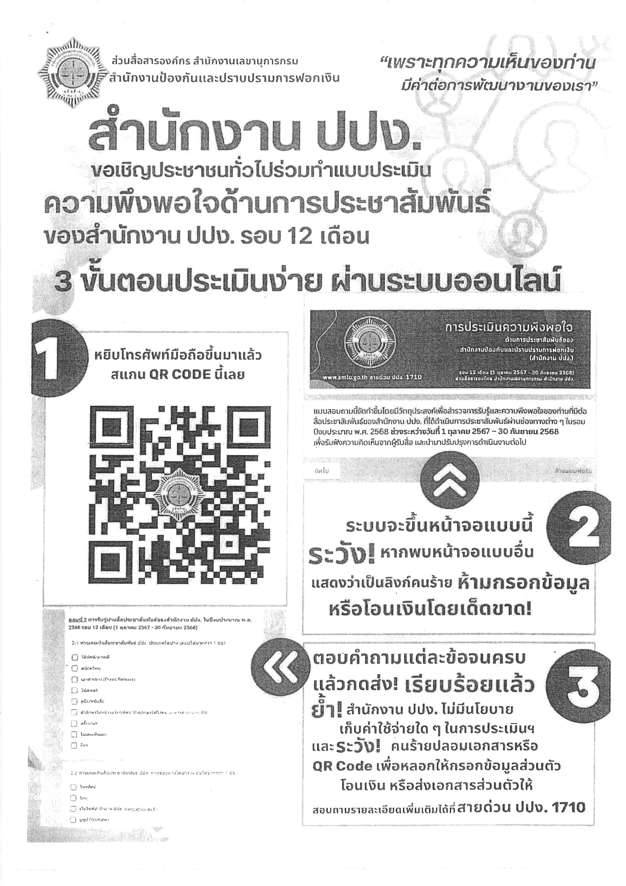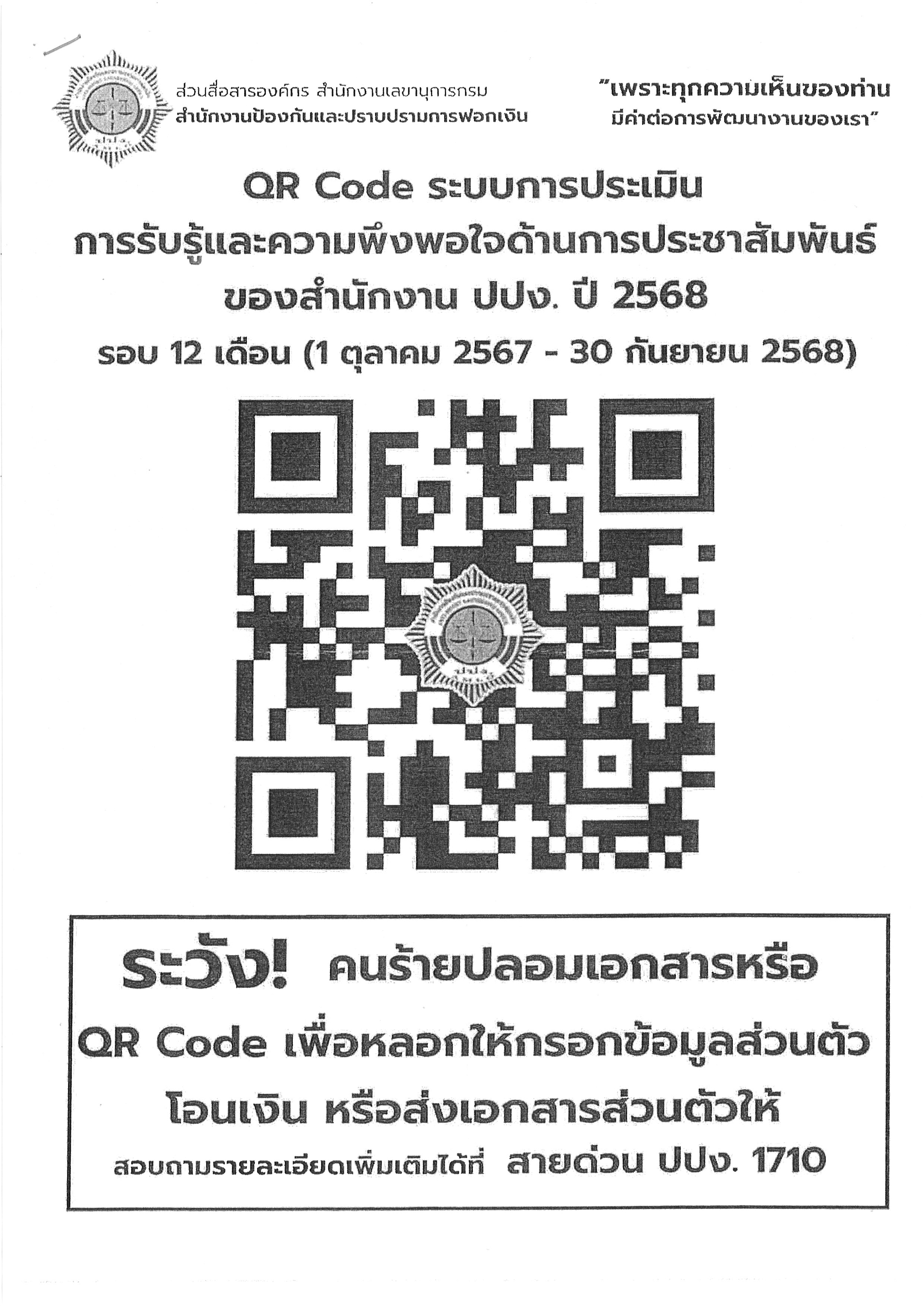 เชิญชวนประชาชนร่วมประเมินความพึงพอใจด้านการประชาสัมพันธ์ของสำนักงาน ปปง. ประจำปีงบประมาณ พ.ศ.๒๕๖๘ รอบ ๑๒ เดือน (๑ ตุลาคม ๒๕๖๗ - ๓๐ กันยายน ๒๕๖๘ ในรูปแบบการประเมินออนไลน์ผ่านระบบ QR Code)