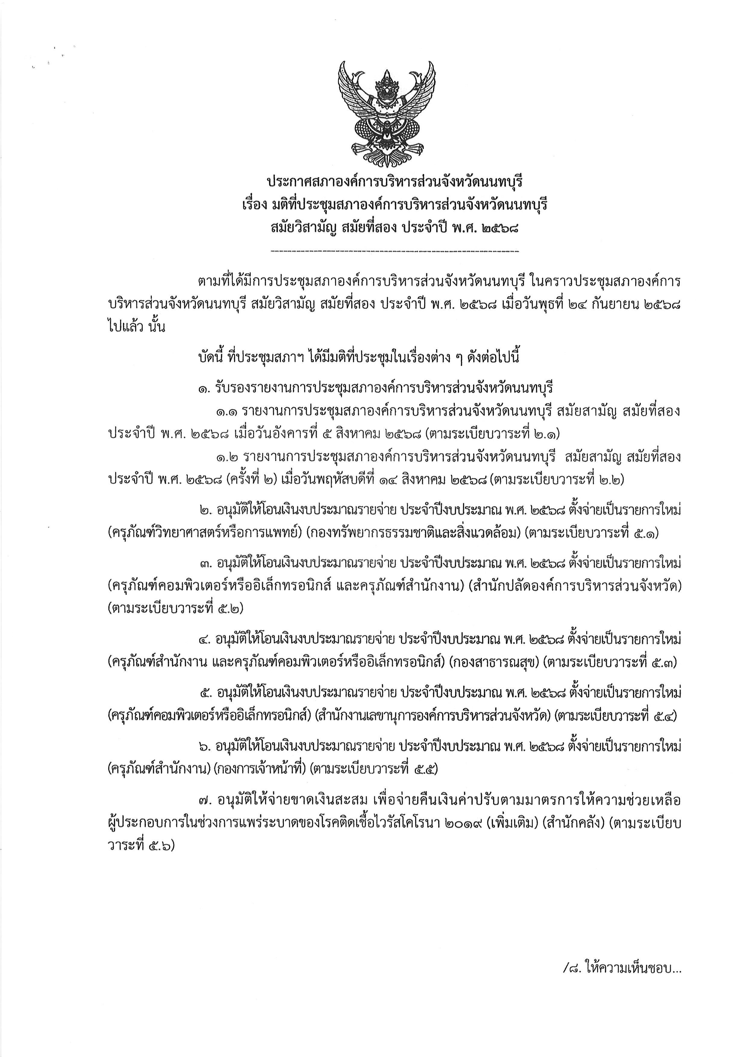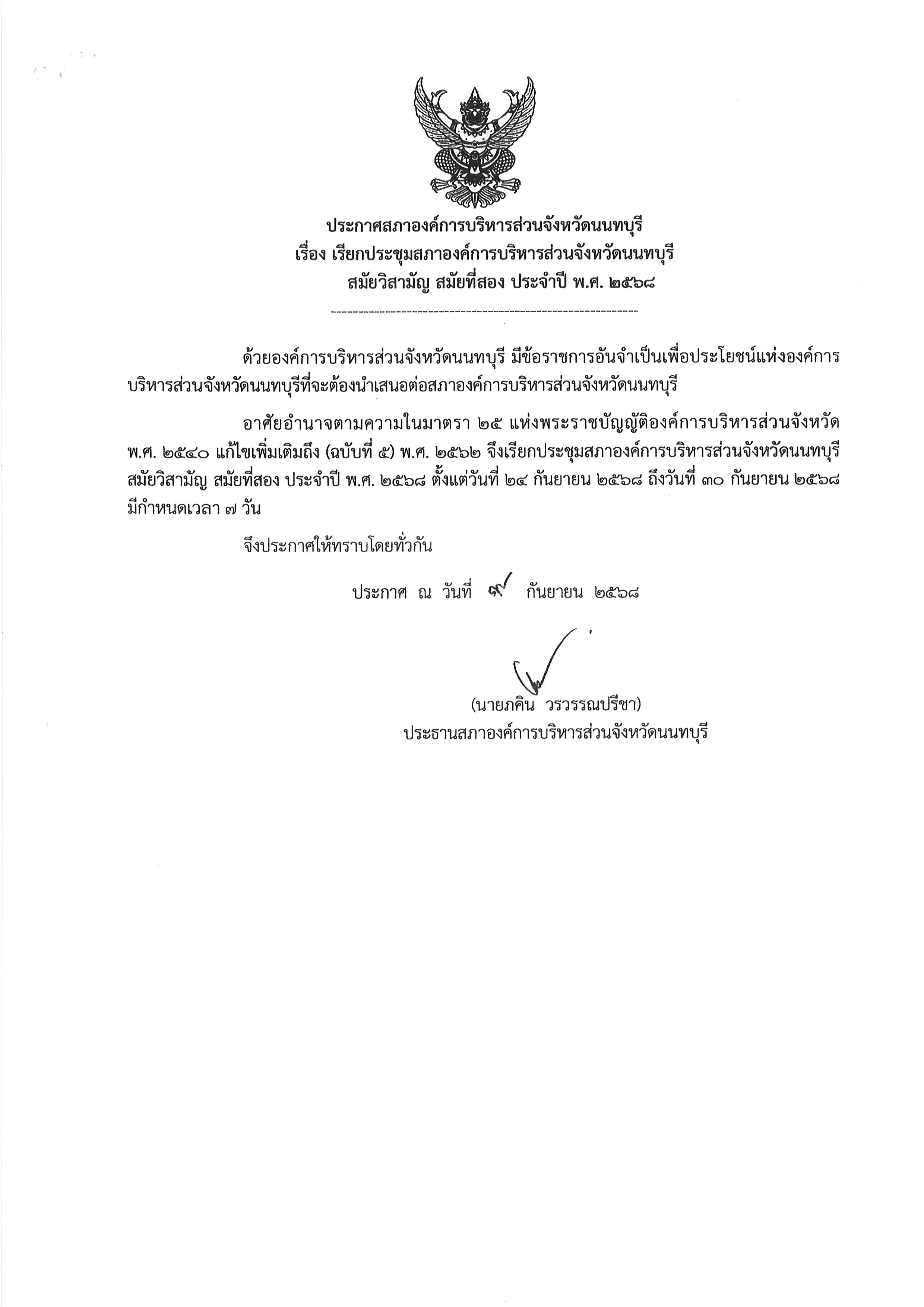 • เรียกประชุมสภาองค์การบริหารส่วนจังหวัดนนทบุรี สมัยวิสามัญ สมัยที่สอง ประจำปี พ.ศ.๒๕๖๘