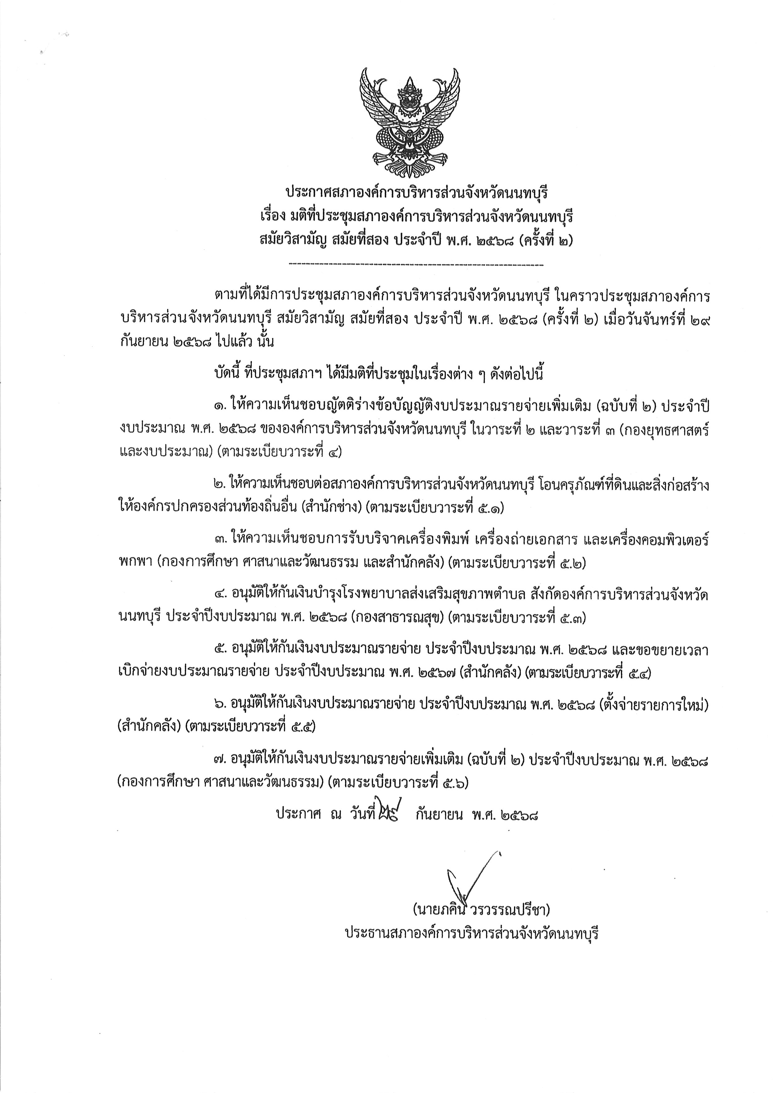 ประกาศสภาองค์การบริหารส่วนจังหวัดนนทบุรี เรื่อง มติที่ประชุมสภาองค์การบริหารส่วนจังหวัดนนทบุรี สมัยวิสามัญ สมัยที่สอง ประจำปี พ.ศ.๒๕๖๘