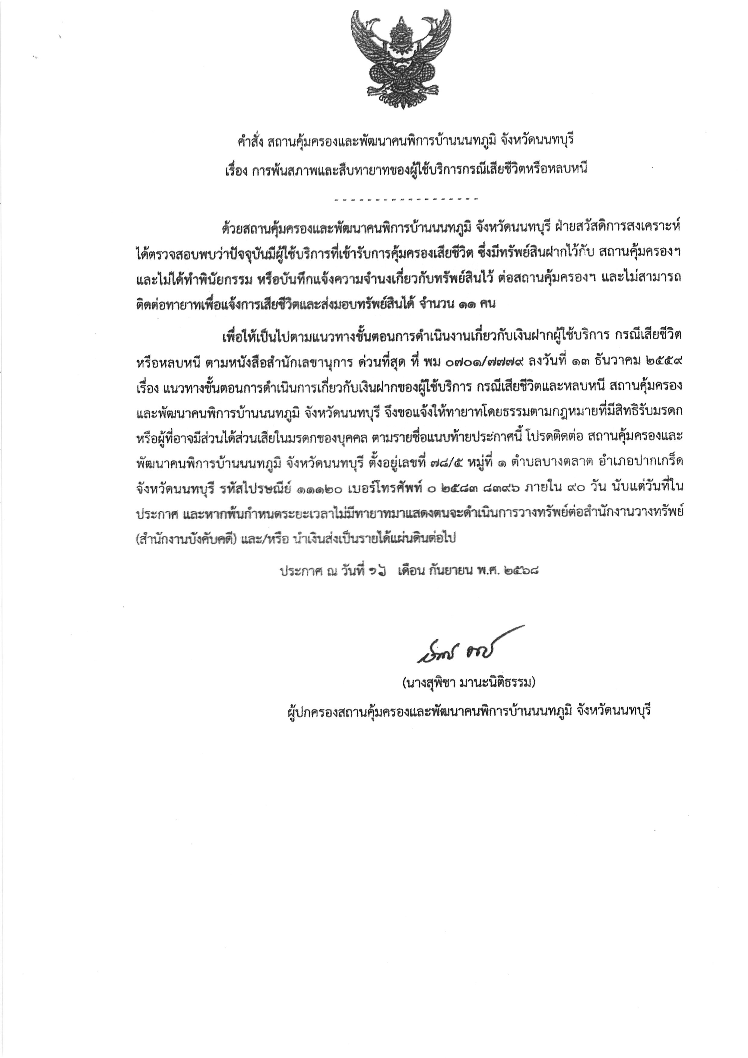 คำสั่งสถานคุ้มครองและพัฒนาคนพิการบ้านนนทภูมิ จังหวัดนนทบุรี