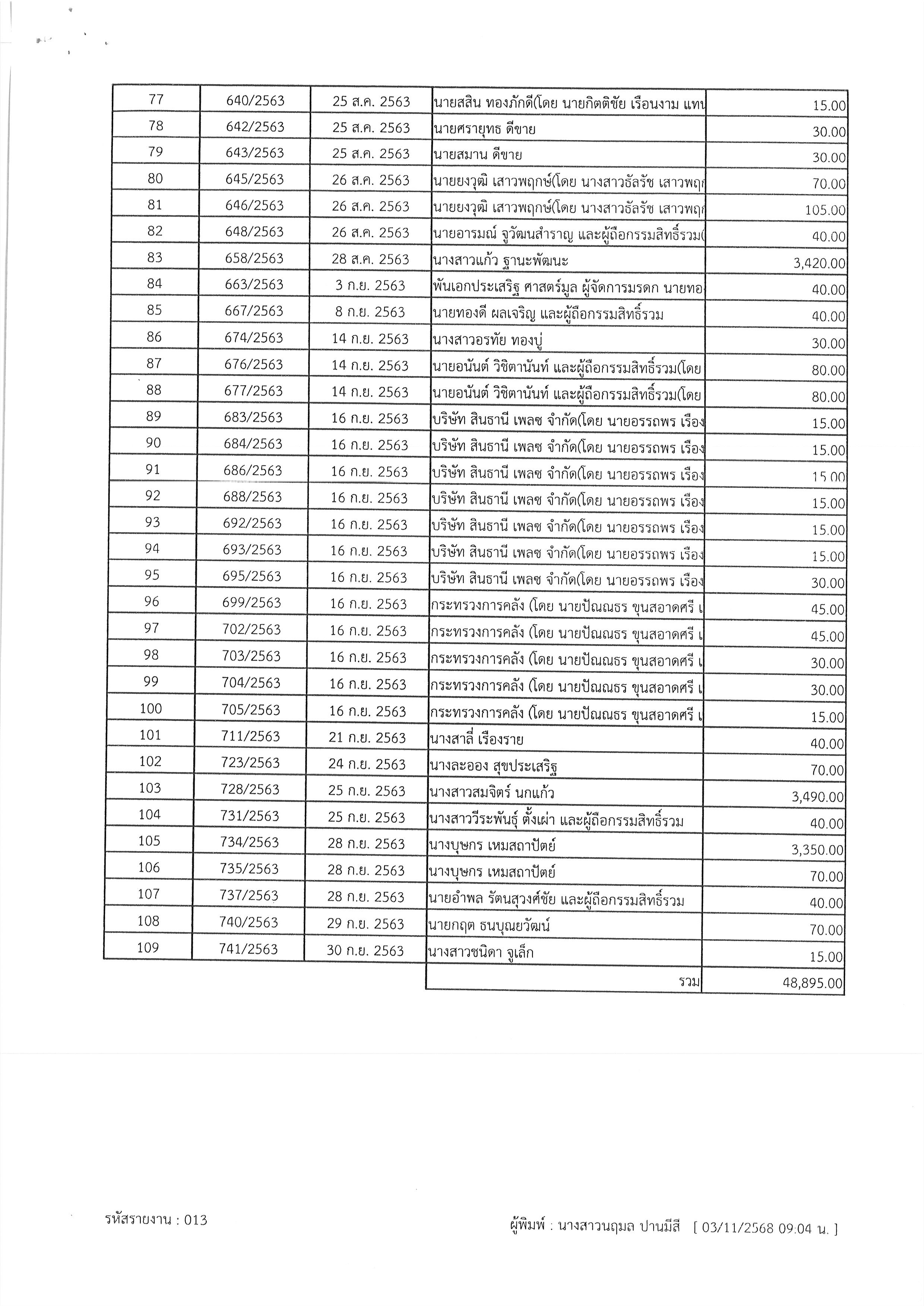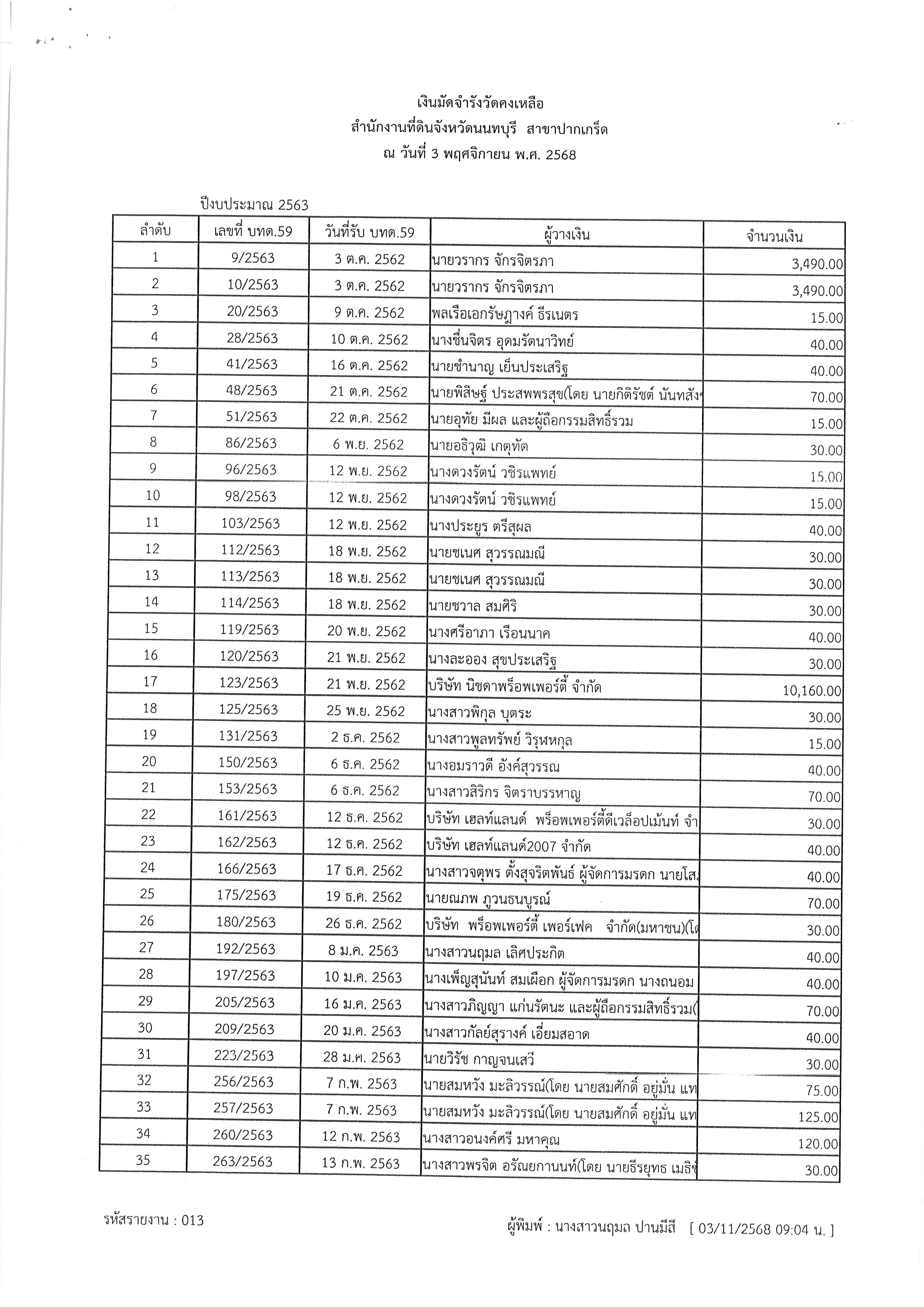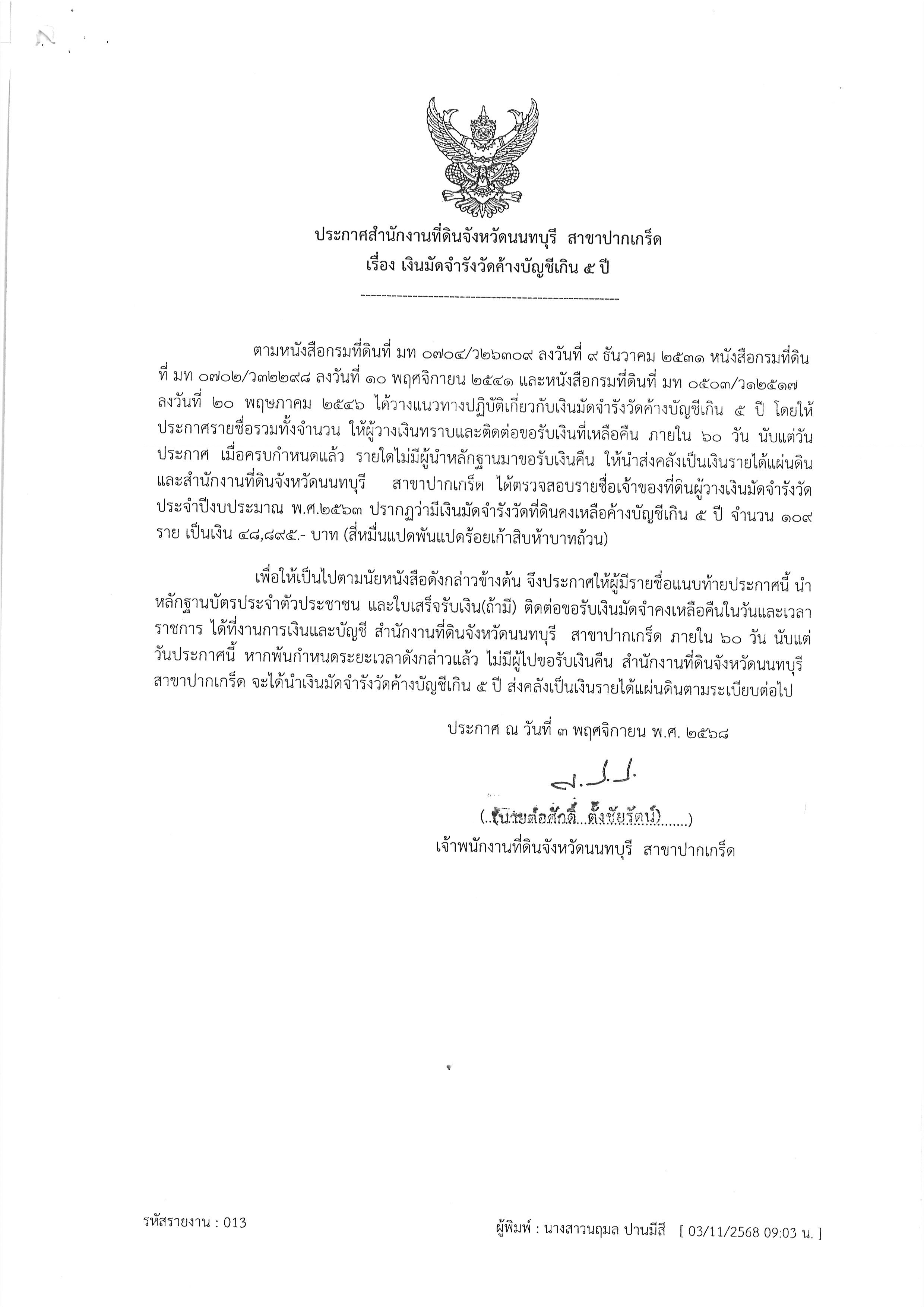 • ประกาศสำนักงานที่ดินจังหวัดนนทบุรี สาขาปากเกร็ด เรื่อง เงินมัดจำรังวัดค้างบัญชีเกิน ๕ ปี