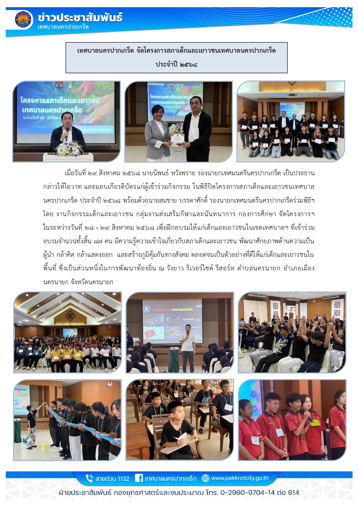 เทศบาลนครปากเกร็ด จัดโครงการสภาเด็กและเยาวชนเทศบาลนครปากเกร็ด ประจำปี ๒๕๖๘
