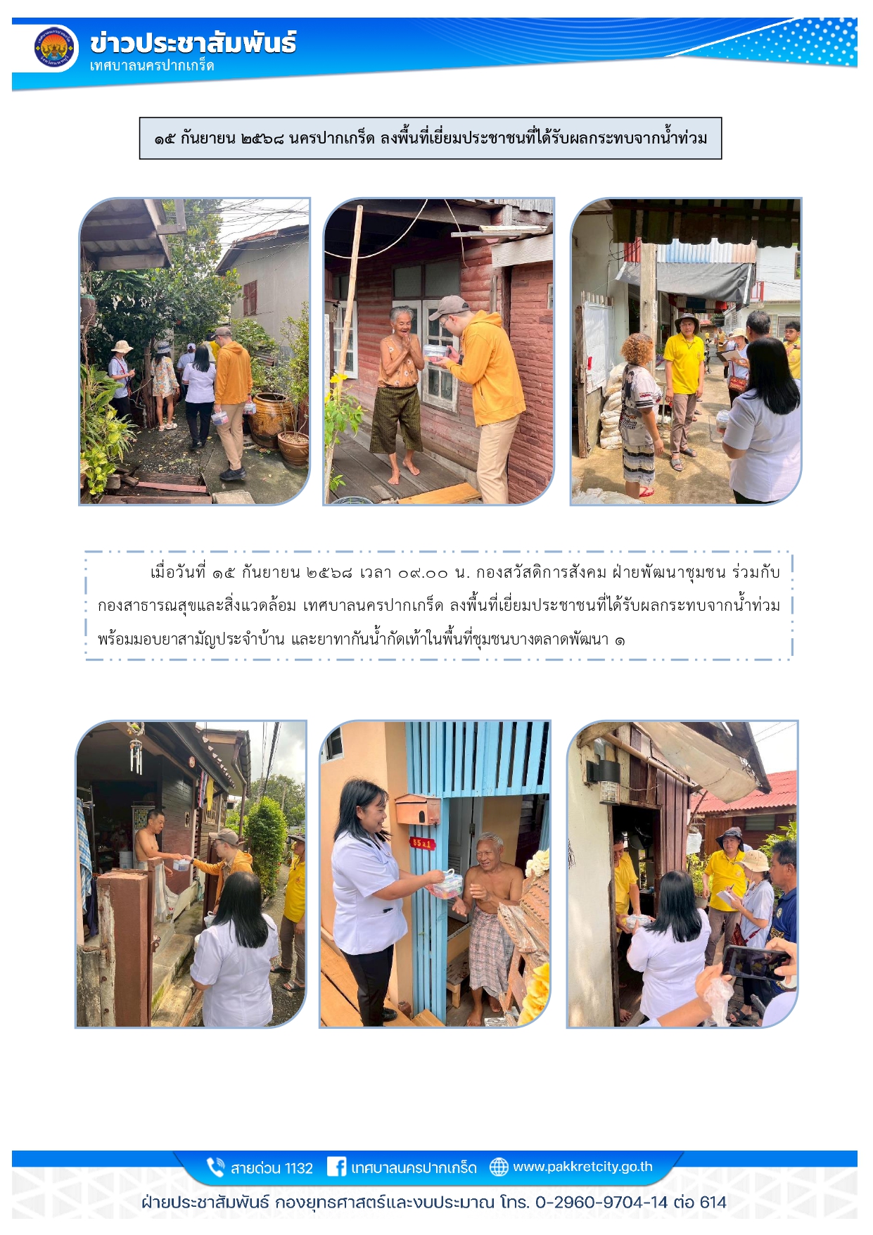 ๑๕ กันยายน ๒๕๖๘ นครปากเกร็ด ลงพื้นที่เยี่ยมประชาชนที่ได้รับผลกระทบจากน้ำท่วม