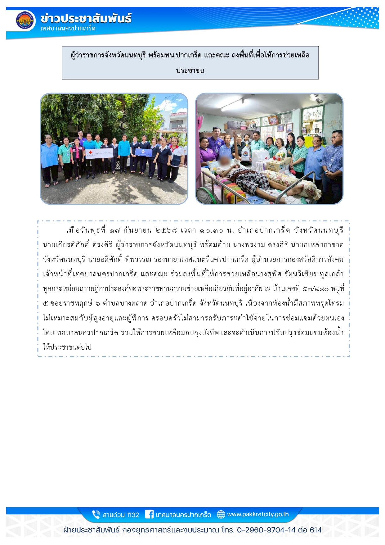 ผู้ว่าราชการจังหวัดนนทบุรี พร้อมทน.ปากเกร็ด และคณะ ลงพื้นที่เพื่อให้การช่วยเหลือ ประชาชน