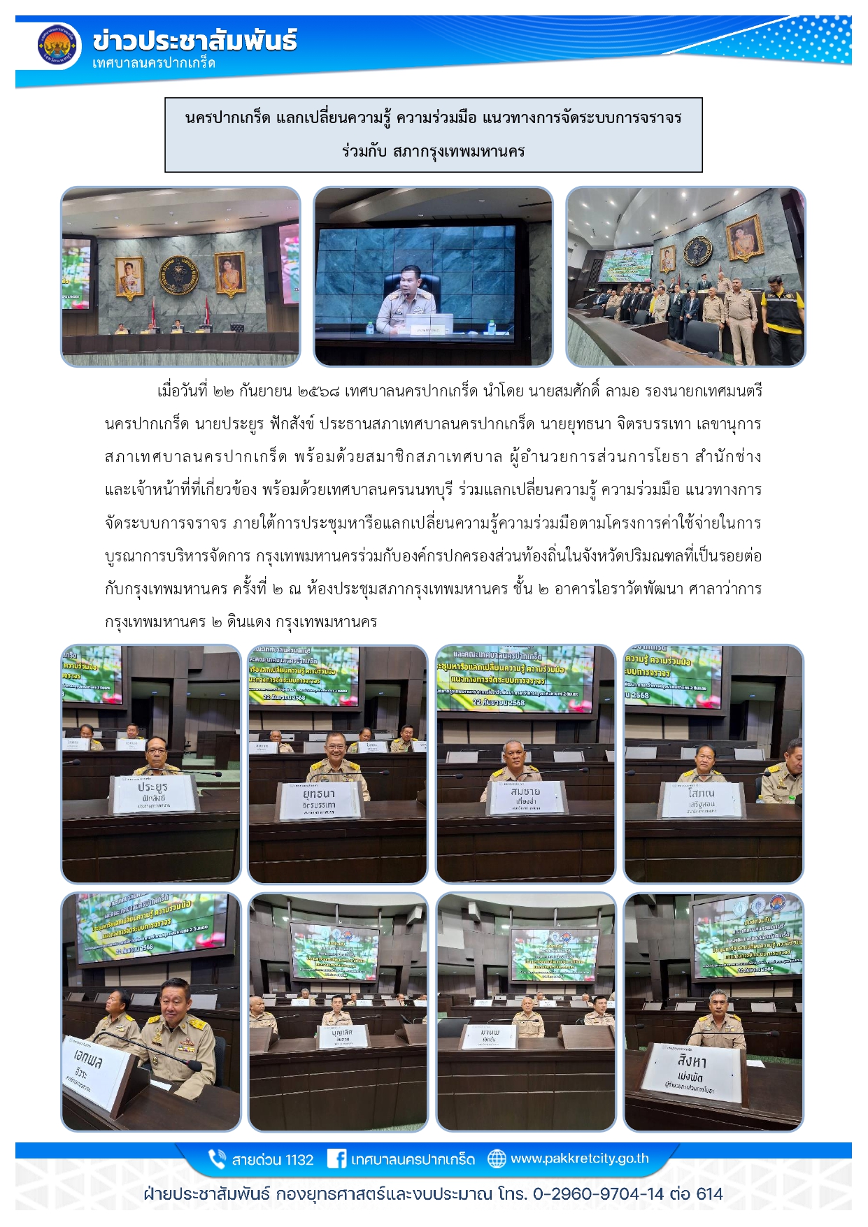 นครปากเกร็ด แลกเปลี่ยนความรู้ ความร่วมมือ แนวทางการจัดระบบการจราจร ร่วมกับ สภากรุงเทพมหานคร