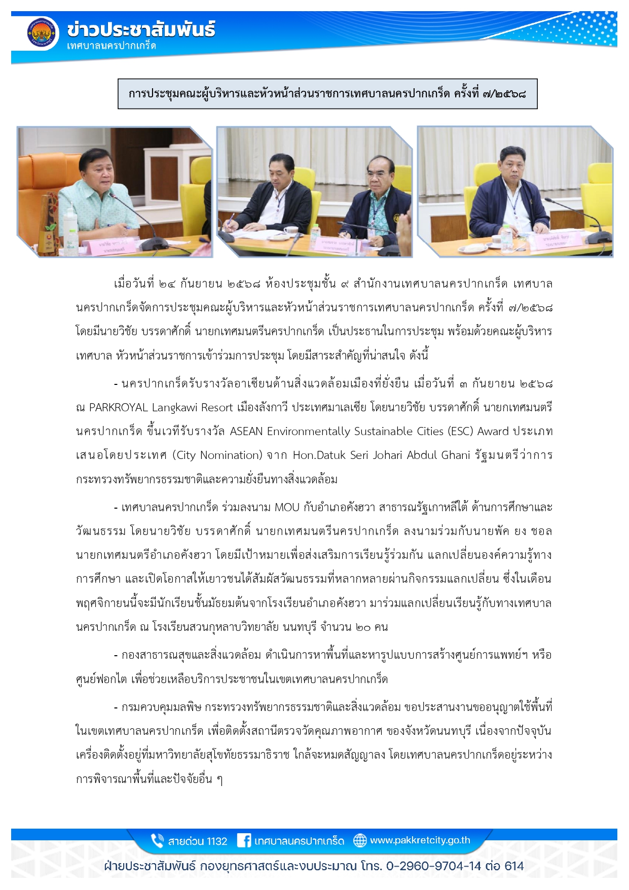 การประชุมคณะผู้บริหารและหัวหน้าส่วนราชการเทศบาลนครปากเกร็ด ครั้งที่ ๗/๒๕๖๘