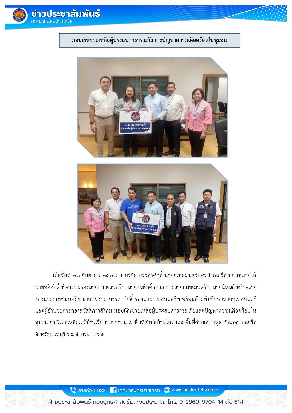 มอบเงินช่วยเหลือผู้ประสบสาธารณภัยและปัญหาความเดือดร้อนในชุมชน