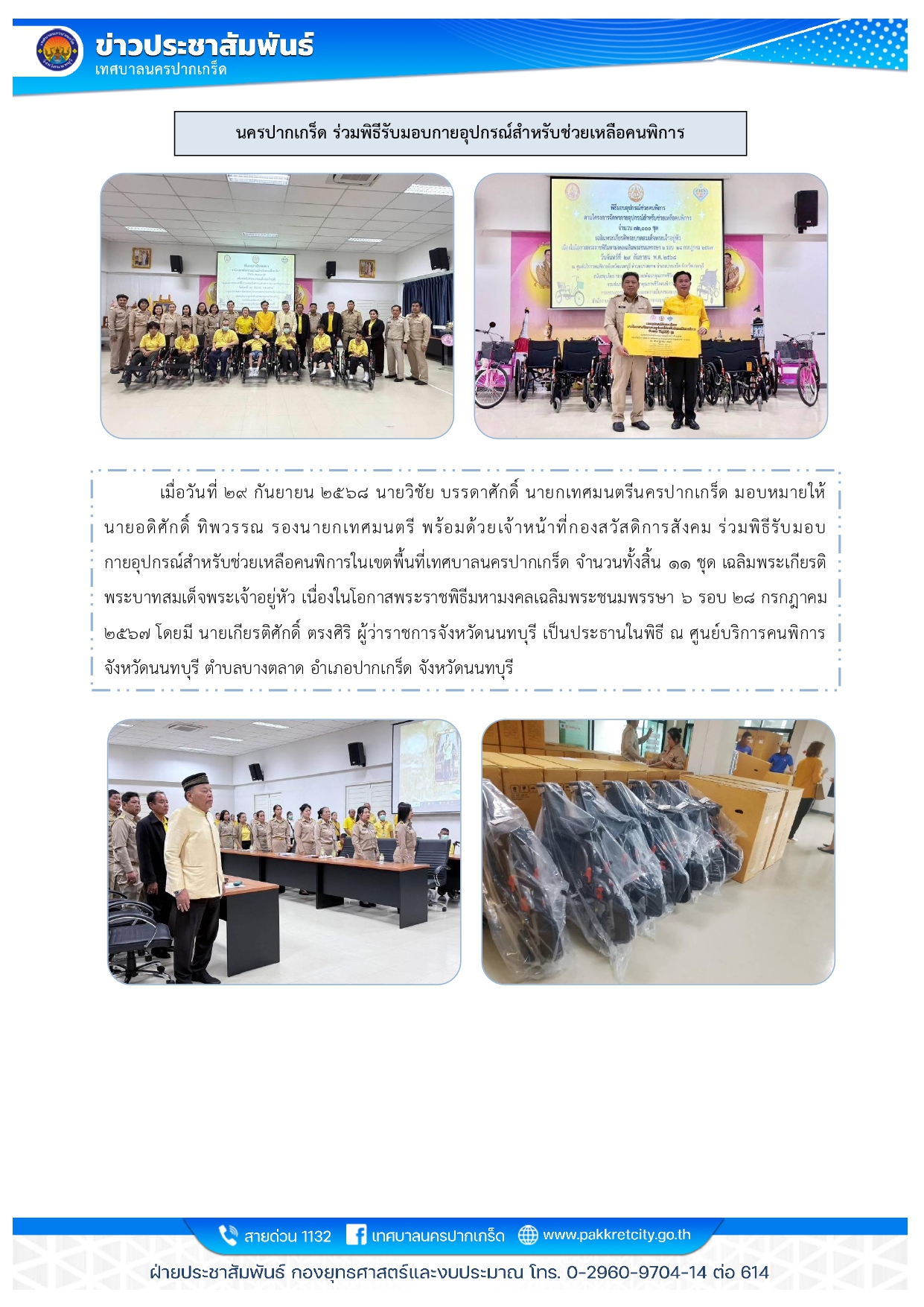 นครปากเกร็ด ร่วมพิธีรับมอบกายอุปกรณ์สำหรับช่วยเหลือคนพิการ
