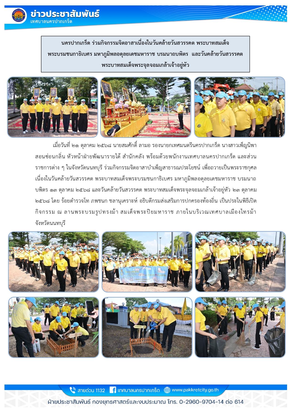 นครปากเกร็ด ร่วมกิจกรรมจิตอาสาเนื่องในวันคล้ายวันสวรรคต พระบาทสมเด็จ พระบรมชนกาธิเบศร มหาภูมิพลอดุลยเดชมหาราช บรมนาถบพิตร และวันคล้ายวันสวรรคต พระบาทสมเด็จพระจุลจอมเกล้าเจ้าอยู่หัว