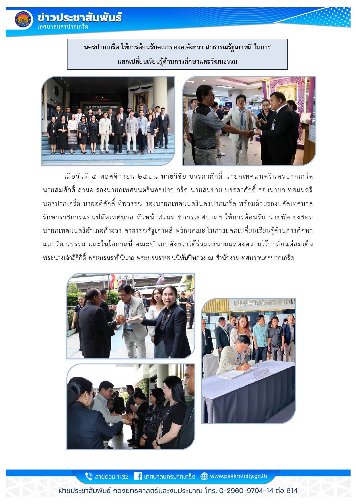 นครปากเกร็ด ให้การต้อนรับคณะของอ.คังฮวา สาธารณรัฐเกาหลี ในการ แลกเปลี่ยนเรียนรู้ด้านการศึกษาและวัฒนธรรม
