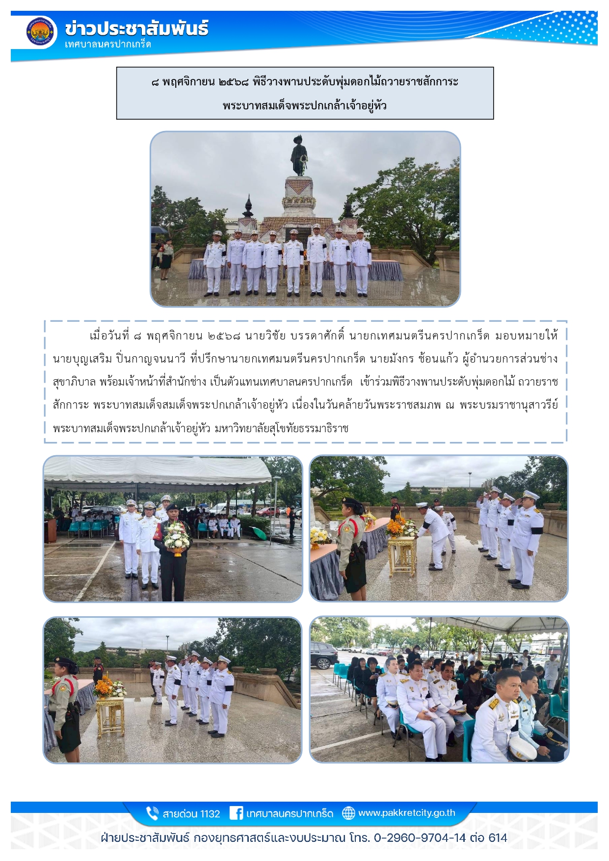 ๘ พฤศจิกายน ๒๕๖๘ พิธีวางพานประดับพุ่มดอกไม้ถวายราชสักการะ พระบาทสมเด็จพระปกเกล้าเจ้าอยู่หัว