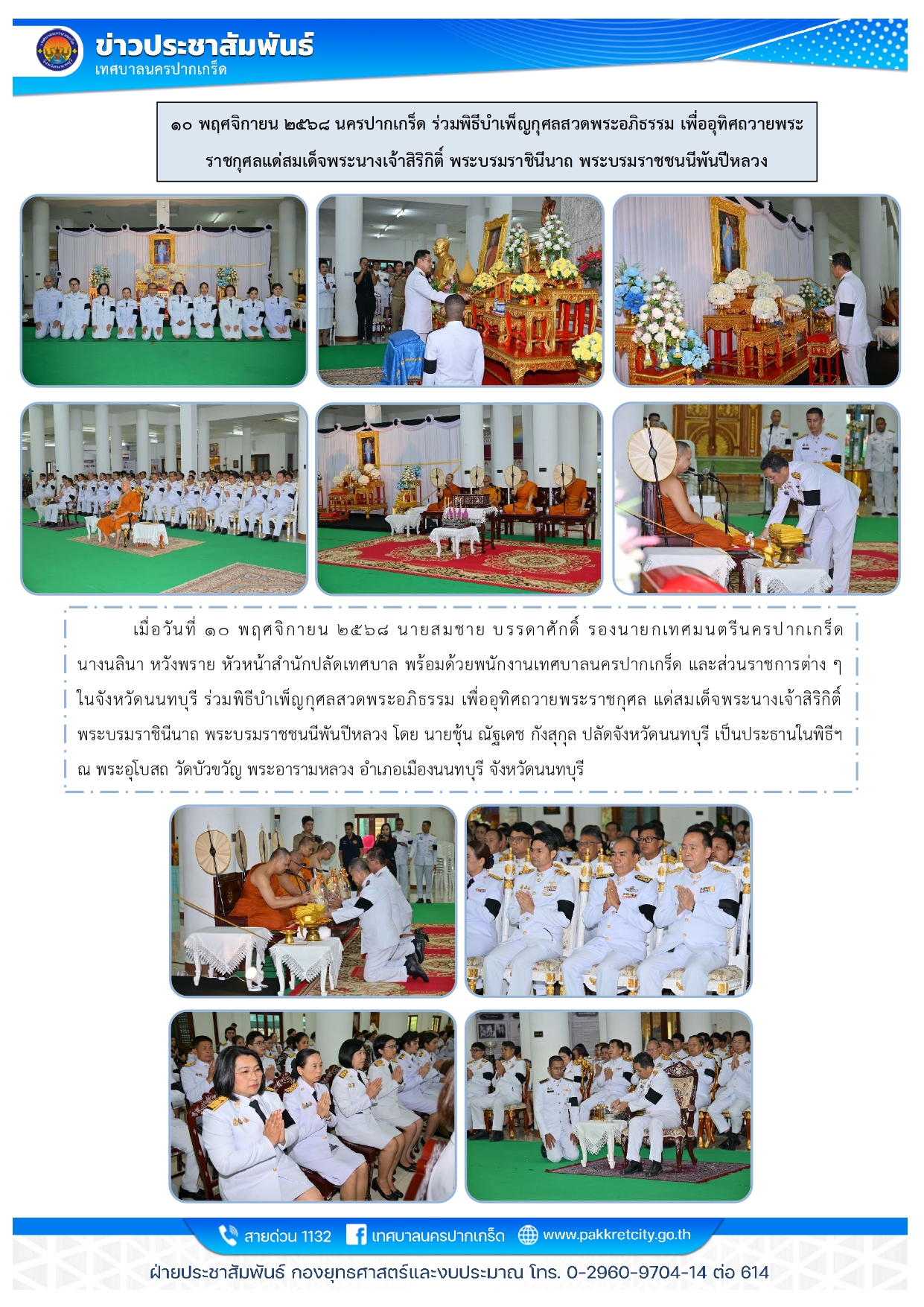 ๑๐ พฤศจิกายน ๒๕๖๘ นครปากเกร็ด ร่วมพิธีบำเพ็ญกุศลสวดพระอภิธรรม เพื่ออุทิศถวายพระ ราชกุศลแด่สมเด็จพระนางเจ้าสิริกิติ์ พระบรมราชินีนาถ พระบรมราชชนนีพันปีหลวง