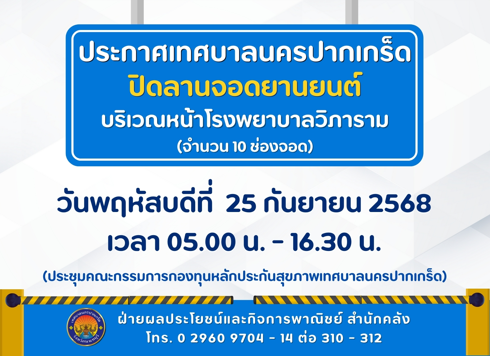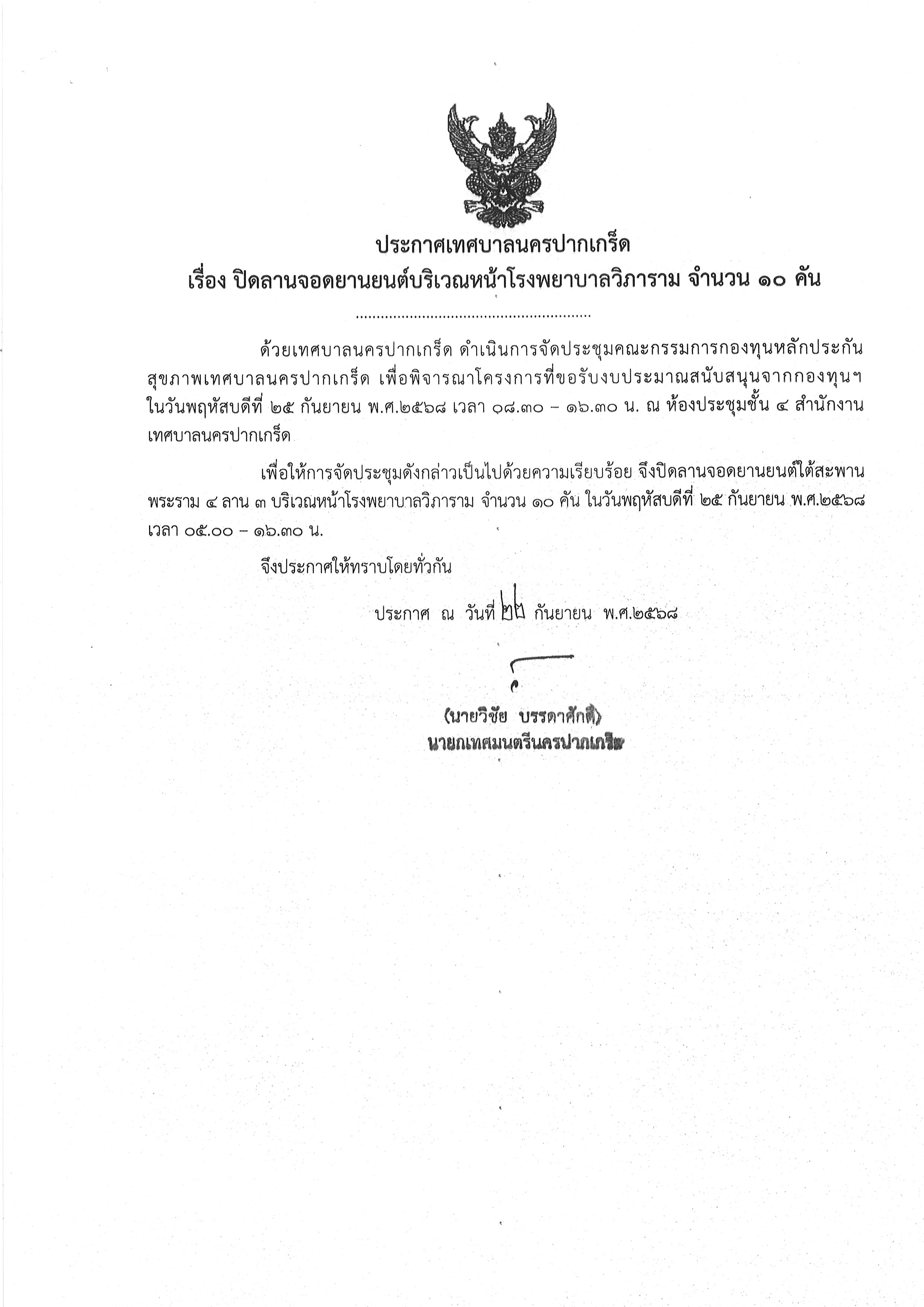 ปิดลานจอดยานยนต์บริเวรหน้าโรงพยาบาลวิภาราม (จำนวน ๑๐ ช่องจอด) ในวันพฤหัสบดีที่ ๒๕ กันยายน ๒๕๖๘
