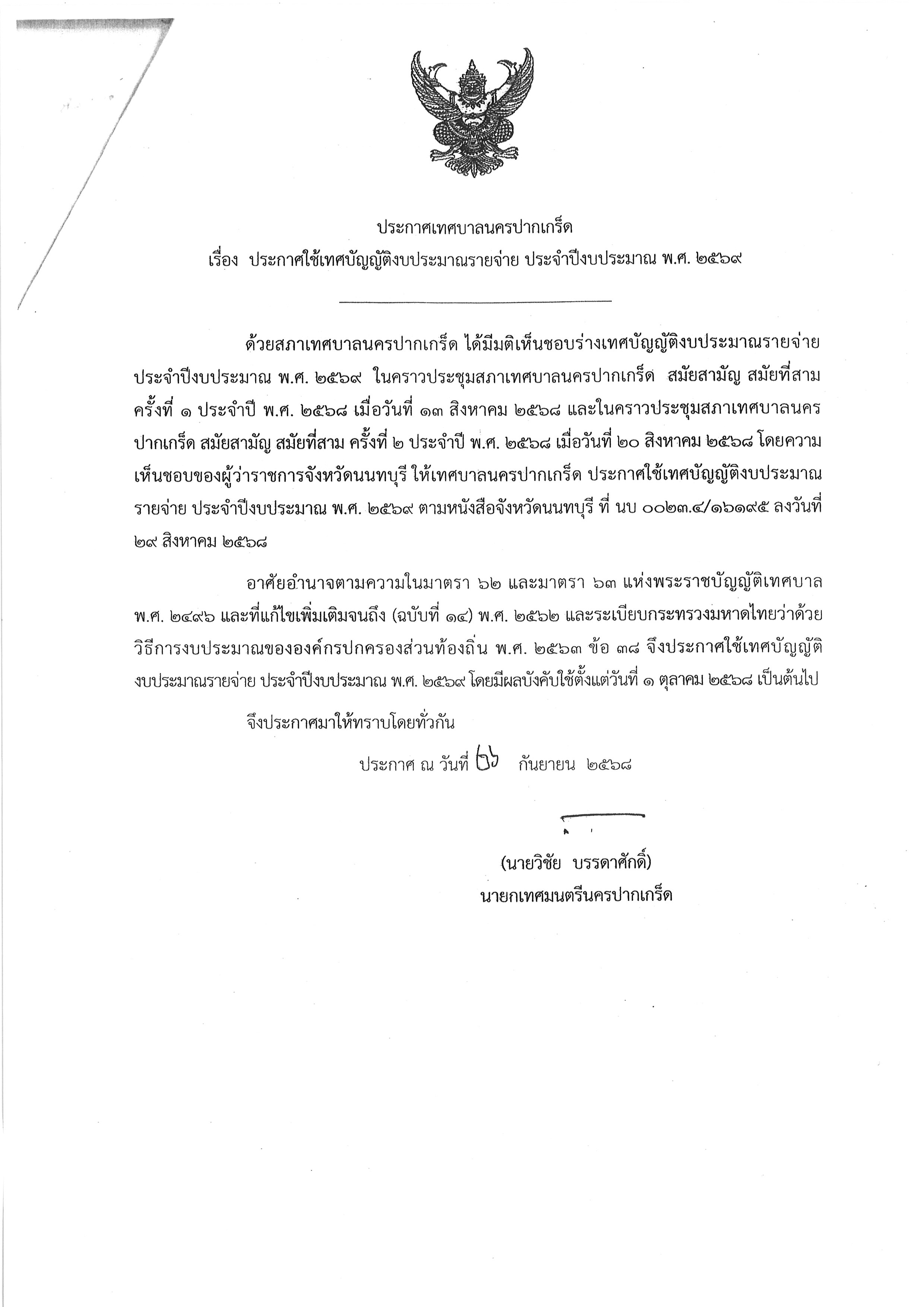 ประกาศเทศบาลนครปากเกร็ด เรื่อง ประกาศใช้เทศบัญญัติงบประมาณรายจ่าย ประจำปีงบประมาณ พ.ศ.๒๕๖๙