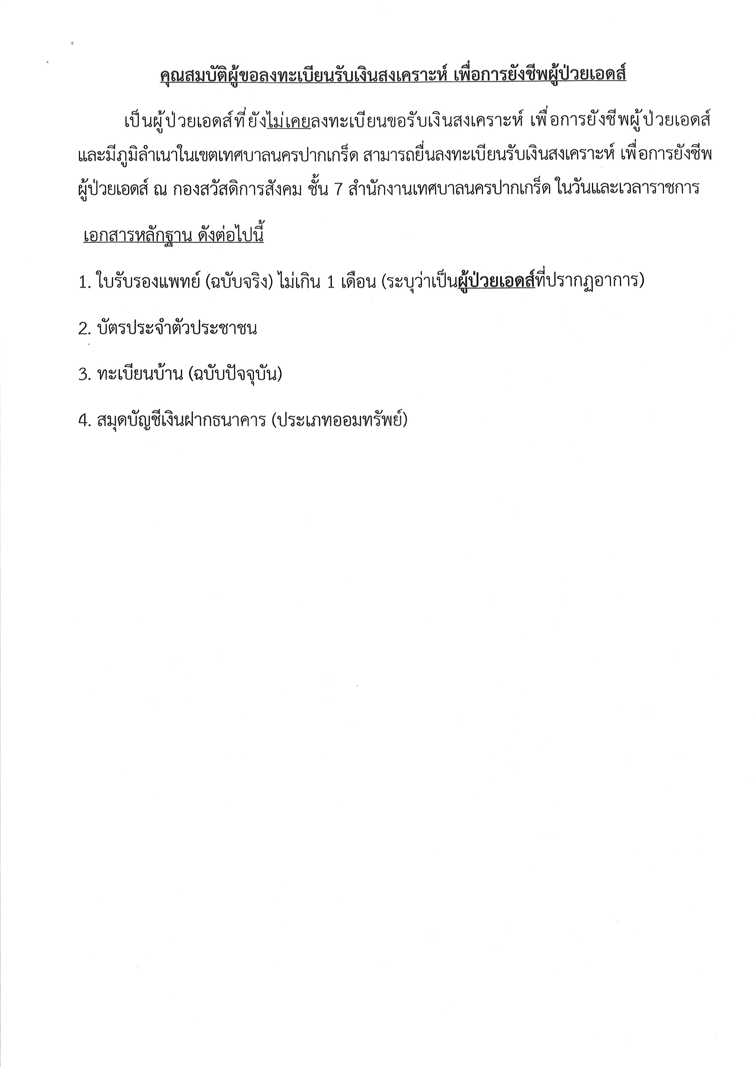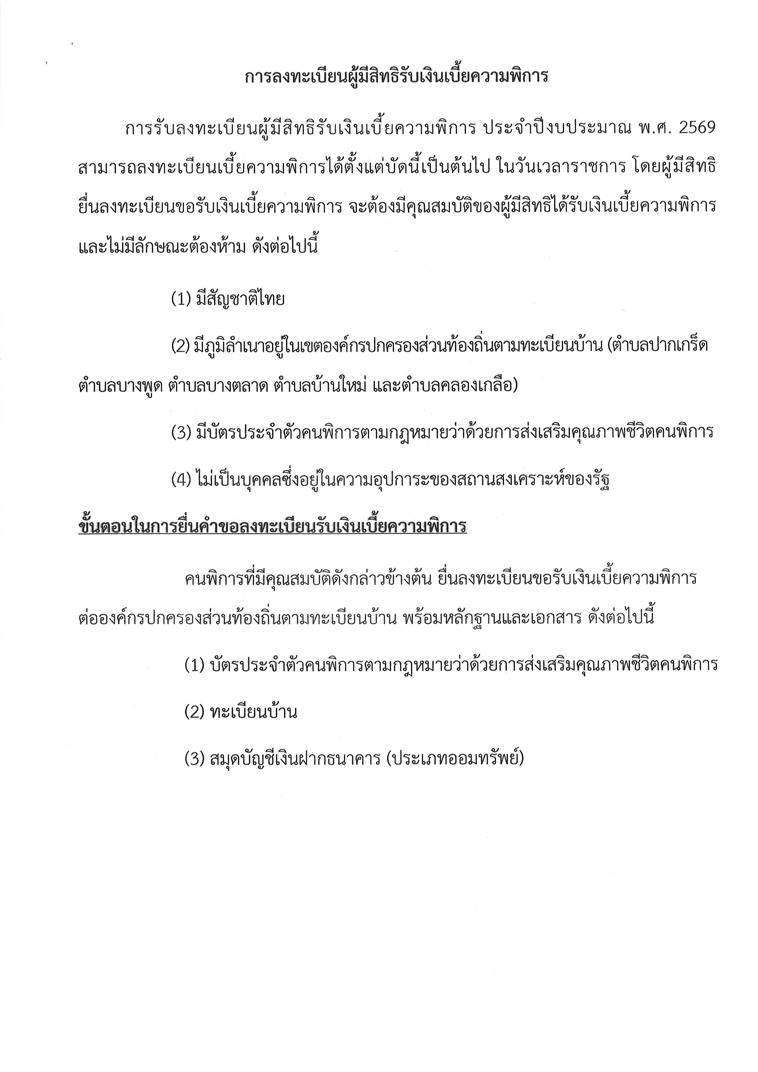การรับลงทะเบียนรับเงินเบี้ยความพิการและเงินสงเคราะห์เพื่อการยังชีพผู้ป่วยเอดส์ของเทศบาลนครปากเกร็ด ประจำปีงบประมาณ พ.ศ.๒๕๖๙