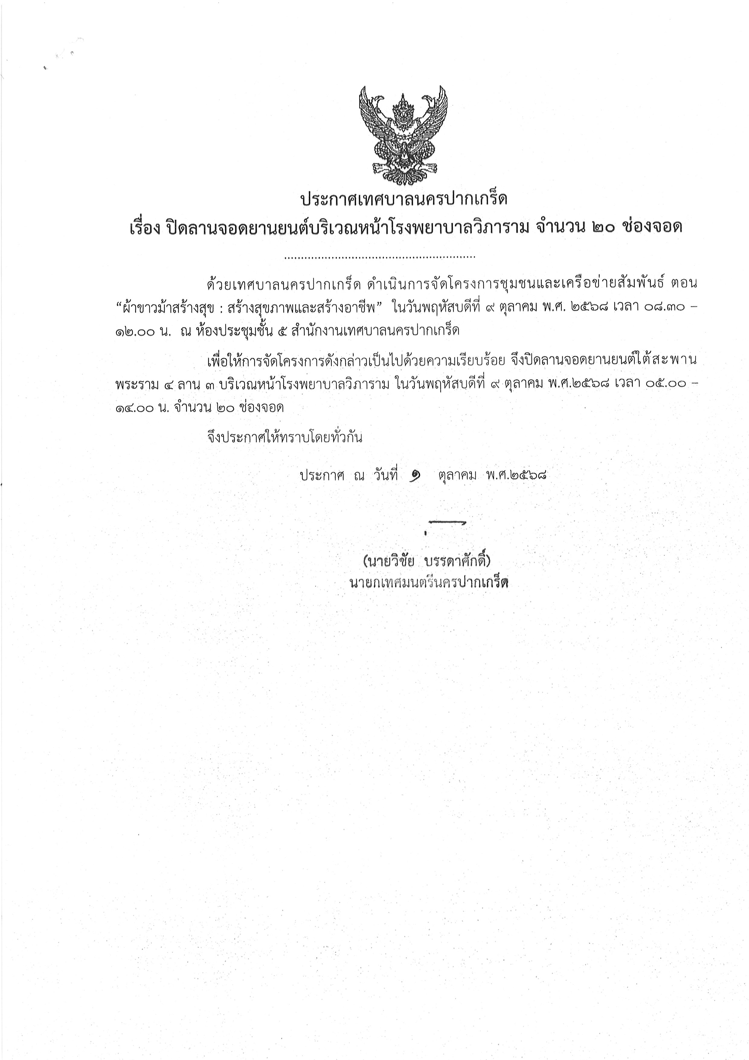 ปิดลานจอดยานยนต์บริเวรหน้าโรงพยาบาลวิภาราม จำนวน ๒๐ ช่องจอด ในวันที่ ๙ ตุลาคม ๒๕๖๘