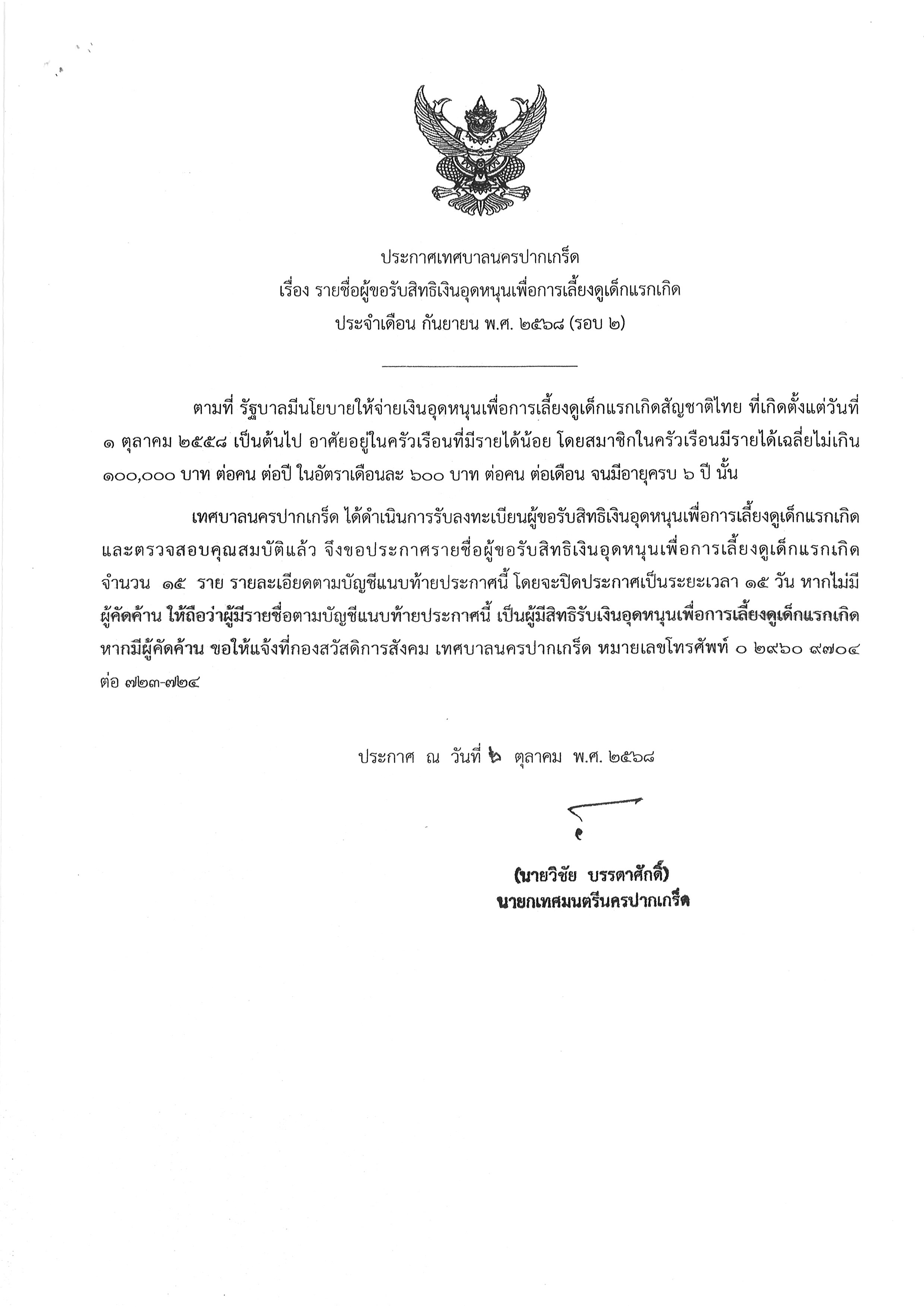 ประกาศเทศบาลนครปากเกร็ด เรื่อง ประกาศรายชื่อผู้มีสิทธิรับเงินอุดหนุนเด็กแรกเกิด ประจำเดือนกันยายน พ.ศ.๒๕๖๘ รอบที่ ๒