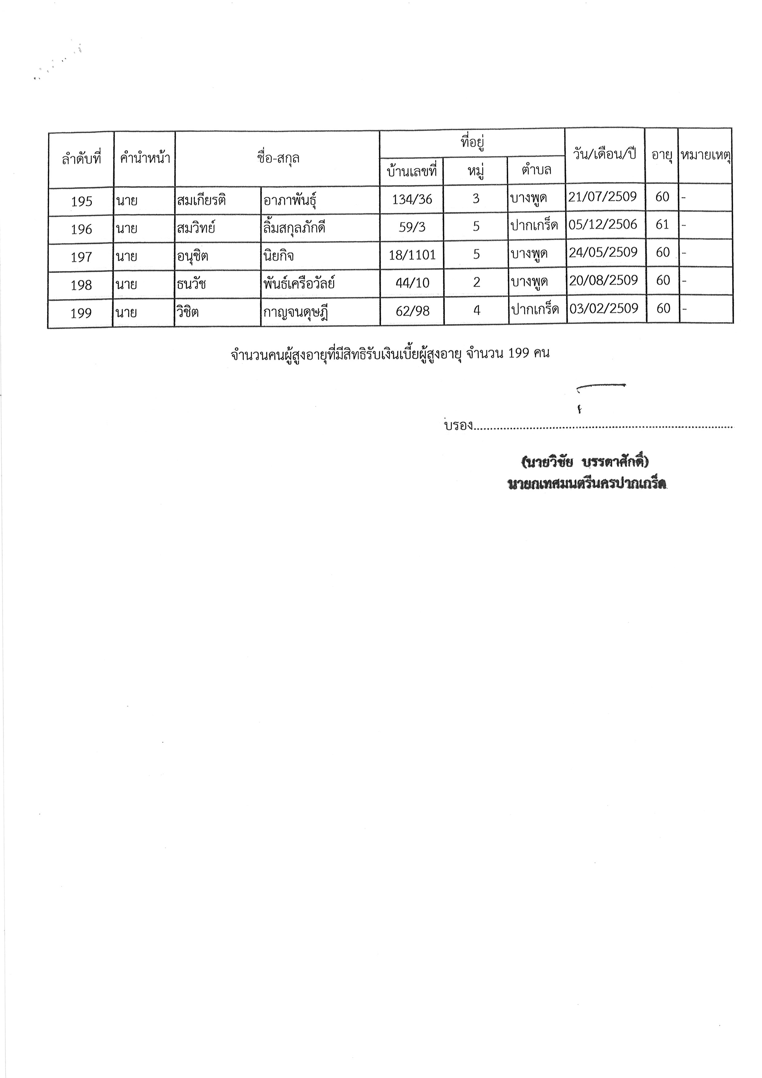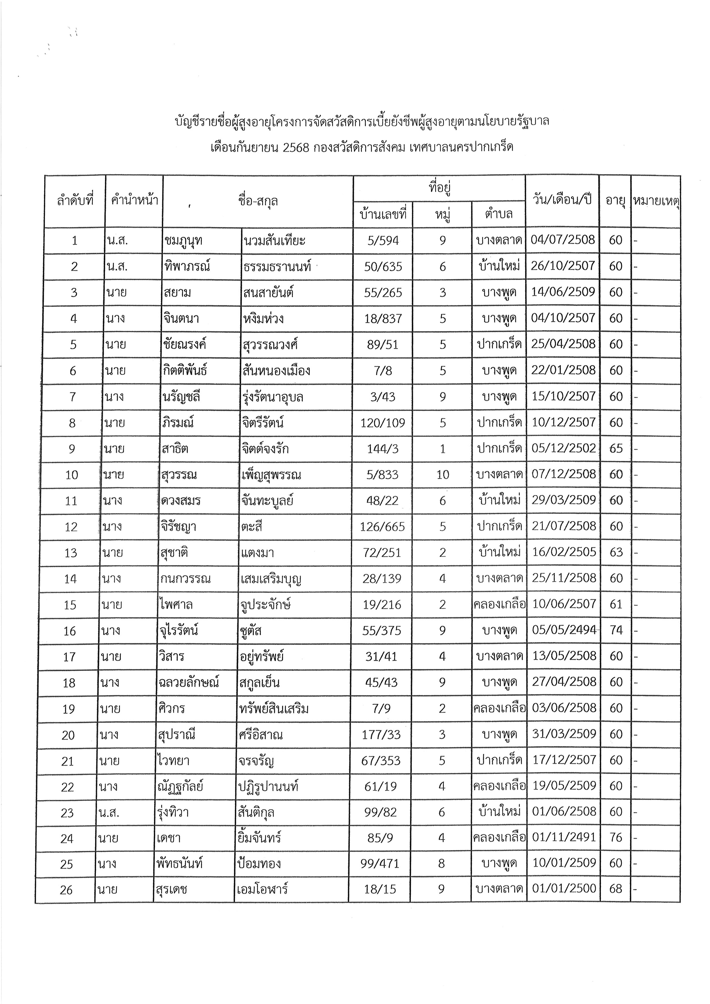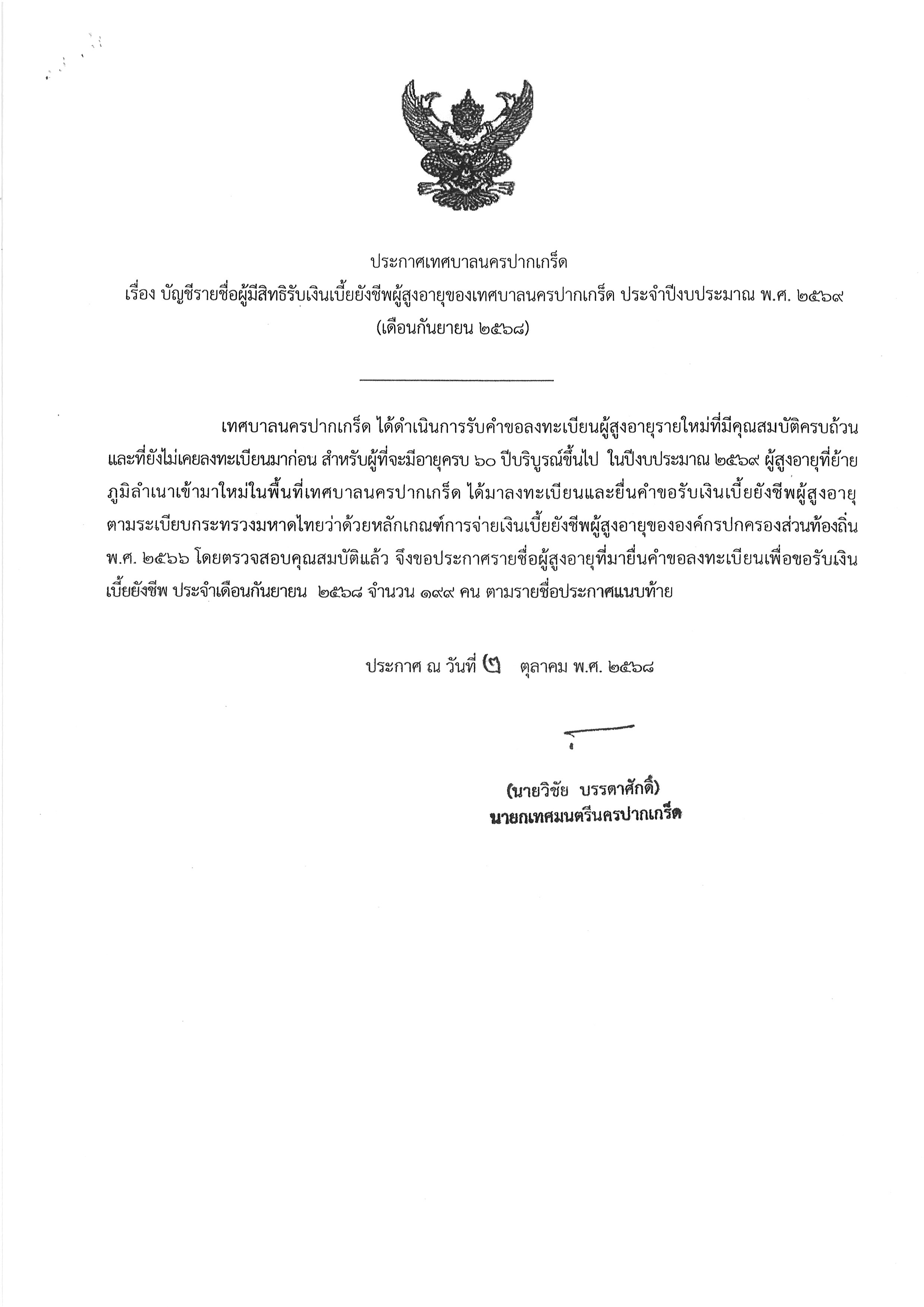 ประกาศเทศบาลนครปากเกร็ด เรื่อง ประกาศบัญชีรายชื่อผู้มีสิทธิรับเงินเบี้ยยังชีพผู้สูงอายุของเทสบาลนครปากเกร็ด ประจำปีงบประมาณ พ.ศ.๒๕๖๙ (เดือนกันยายน ๒๕๖๘)