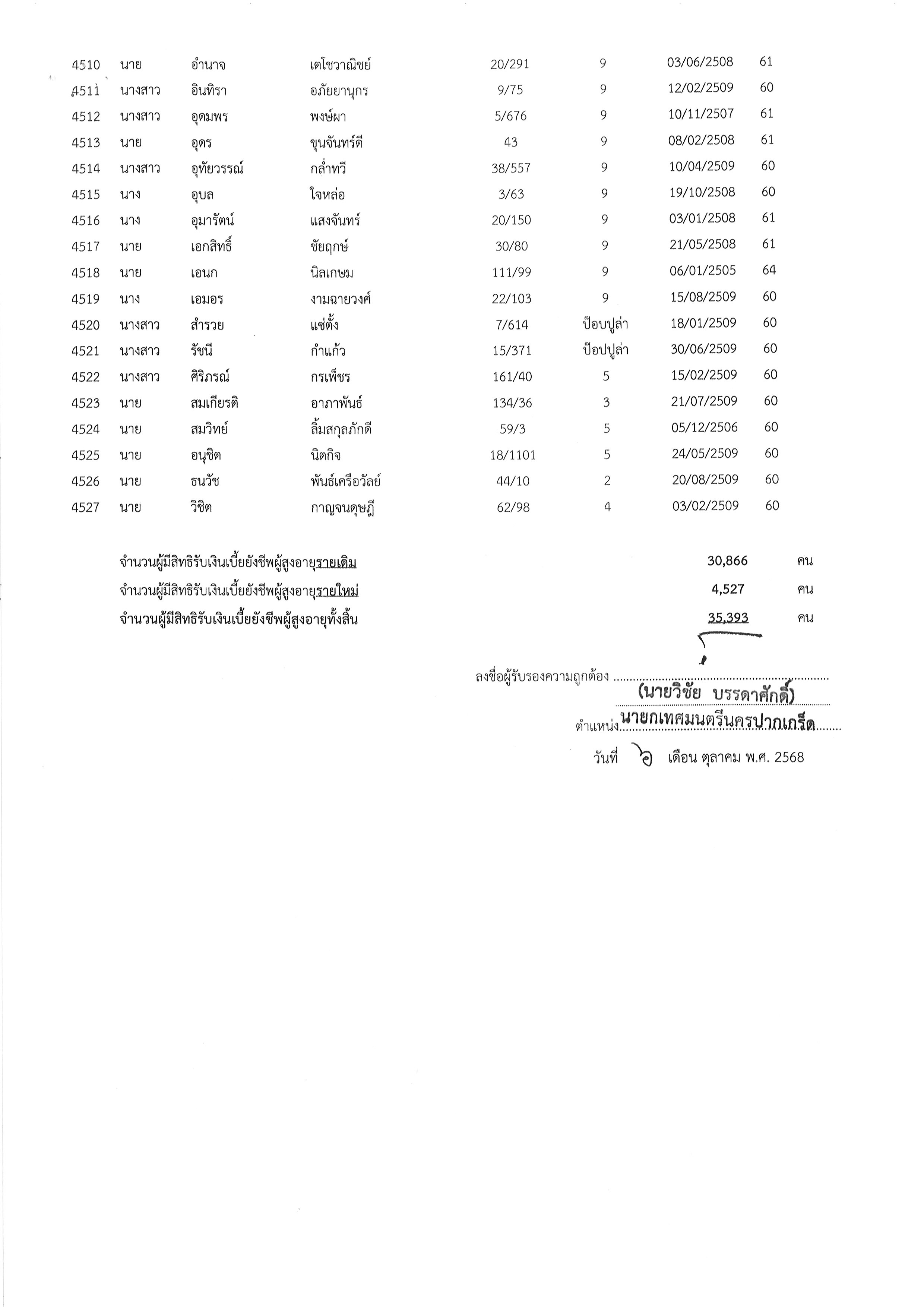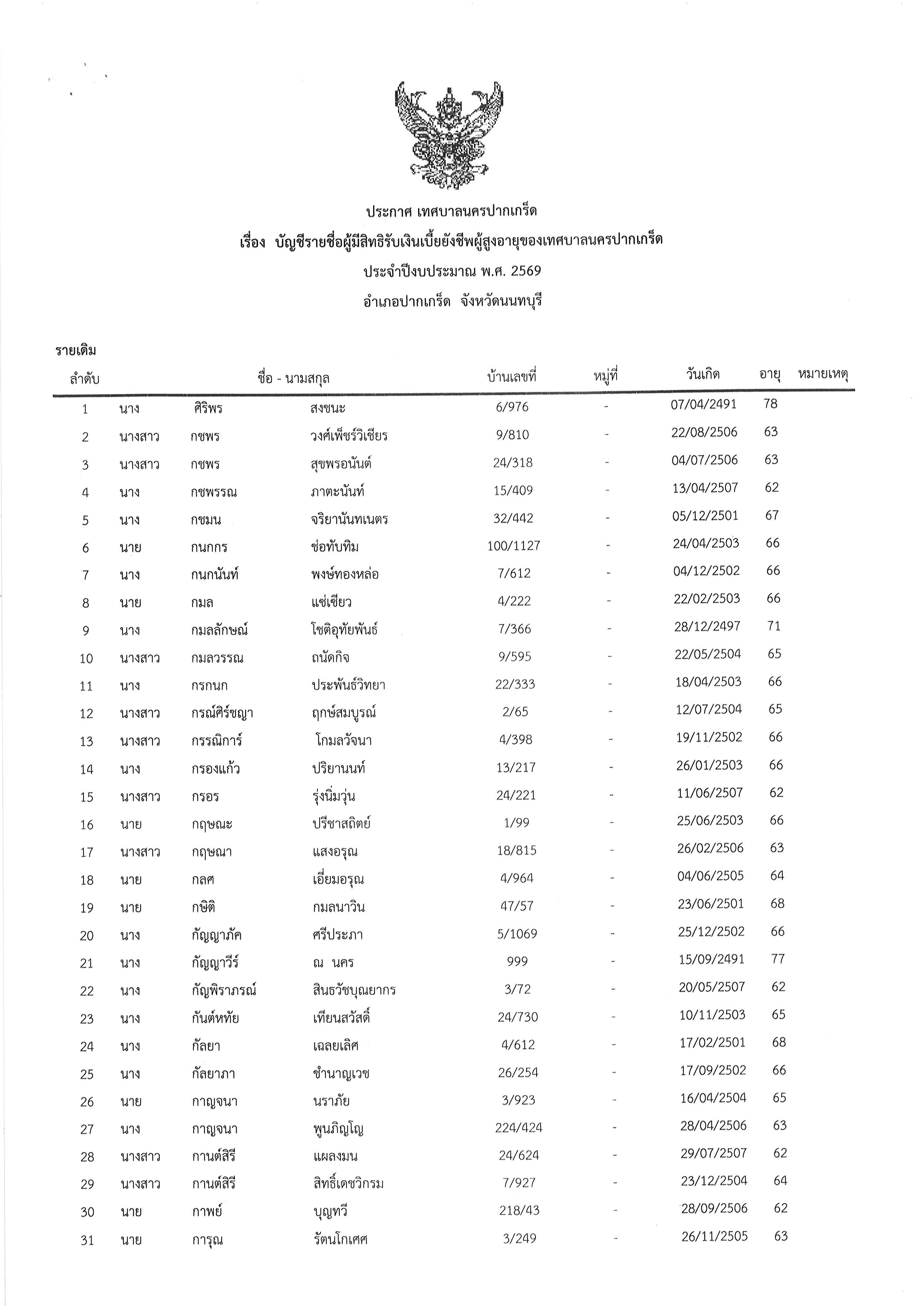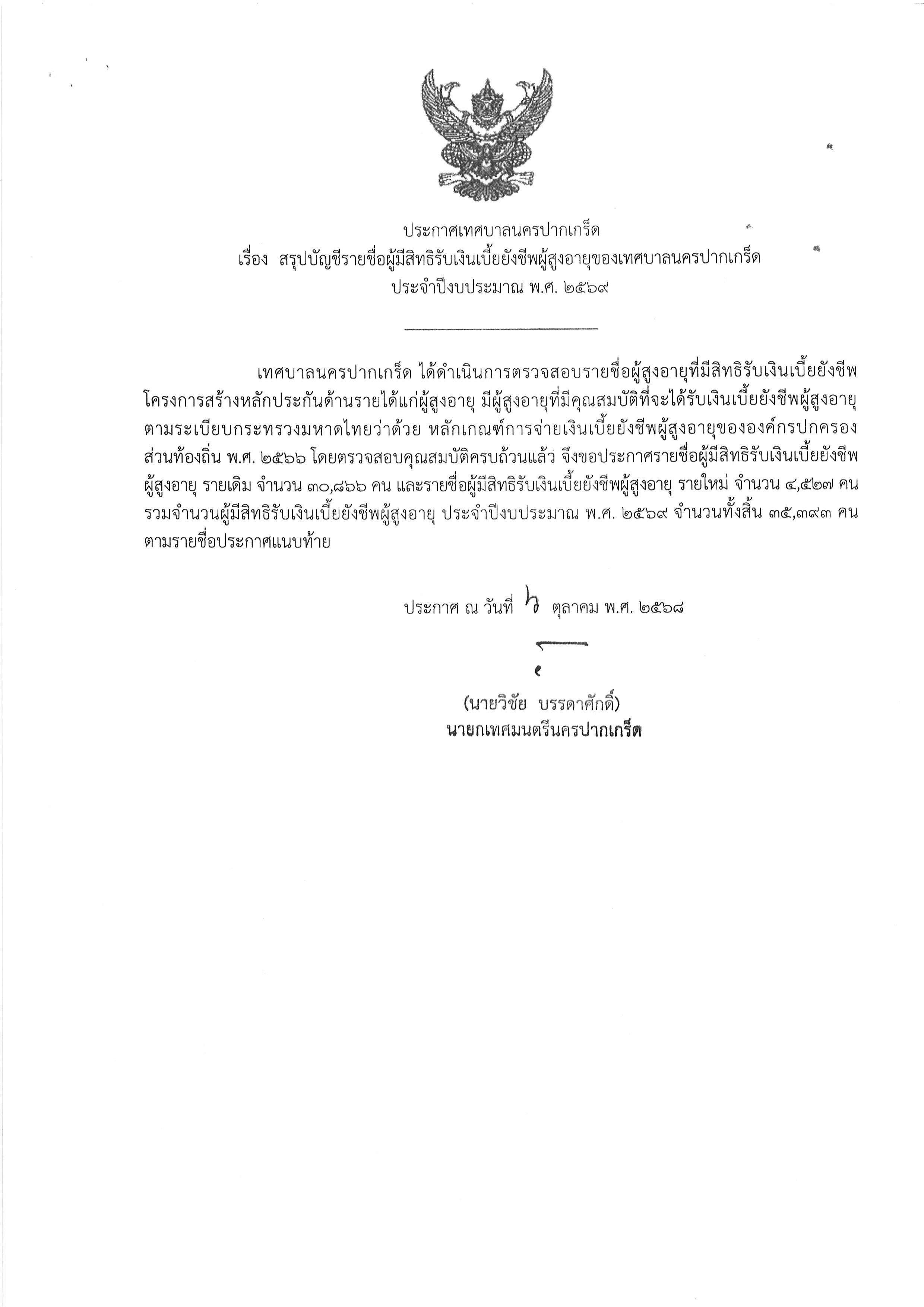 ประกาศเทศบาลนครปากเกร็ด เรื่อง สรุปบัญชีรายชื่อผู้มีสิทธิรับเงินเบี้ยยังชีพผู้สูงอายุของเทศบาลนครปากเกร็ด ประจำปีงบประมาณ พ.ศ.๒๕๖๙