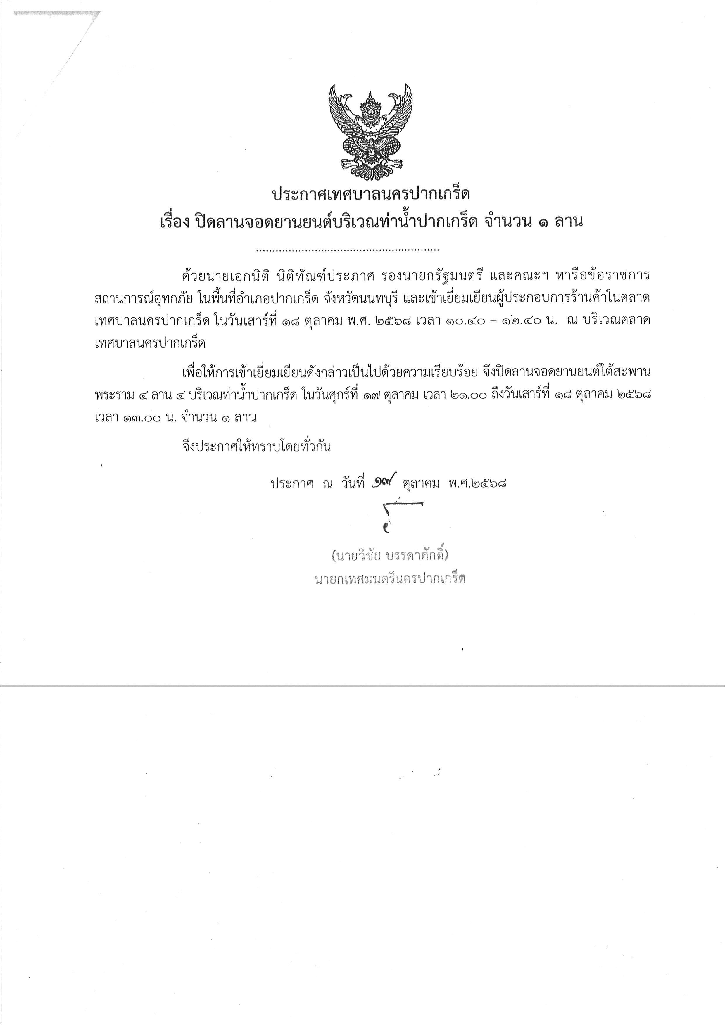 ปิดลานจอดยานยนต์บริเวณท่าน้ำปากเกร็ด จำนวน ๑ ลานจอด ตั้งแต่วันศุกร์ที่ ๑๗ ตุลาคม ๒๕๖๘ เวลา ๒๑.๐๐ น. ถึง วันเสาร์ที่ ๑๘ ตุลาคม ๒๕๖๘ เวลา ๑๓.๐๐ น.