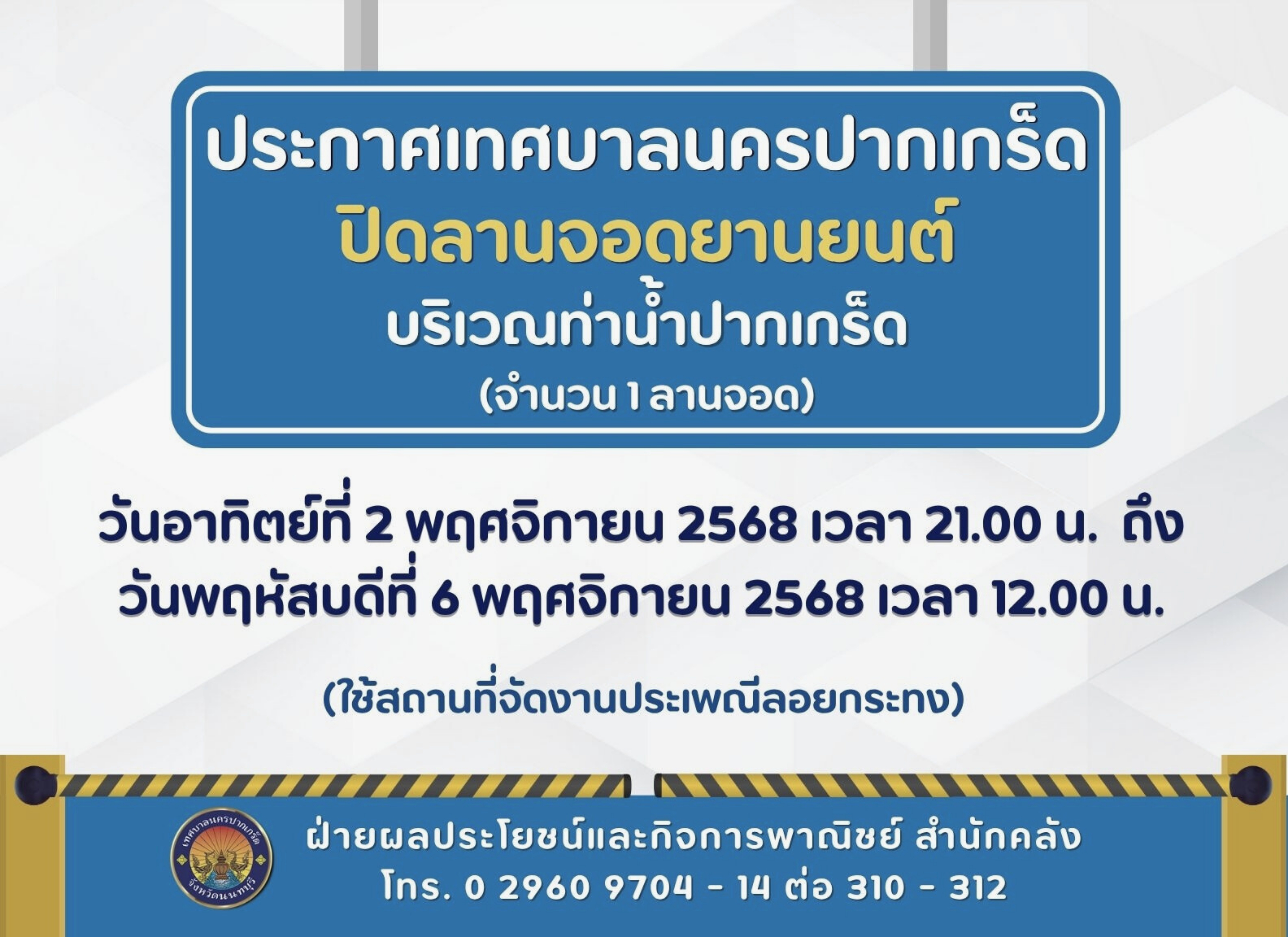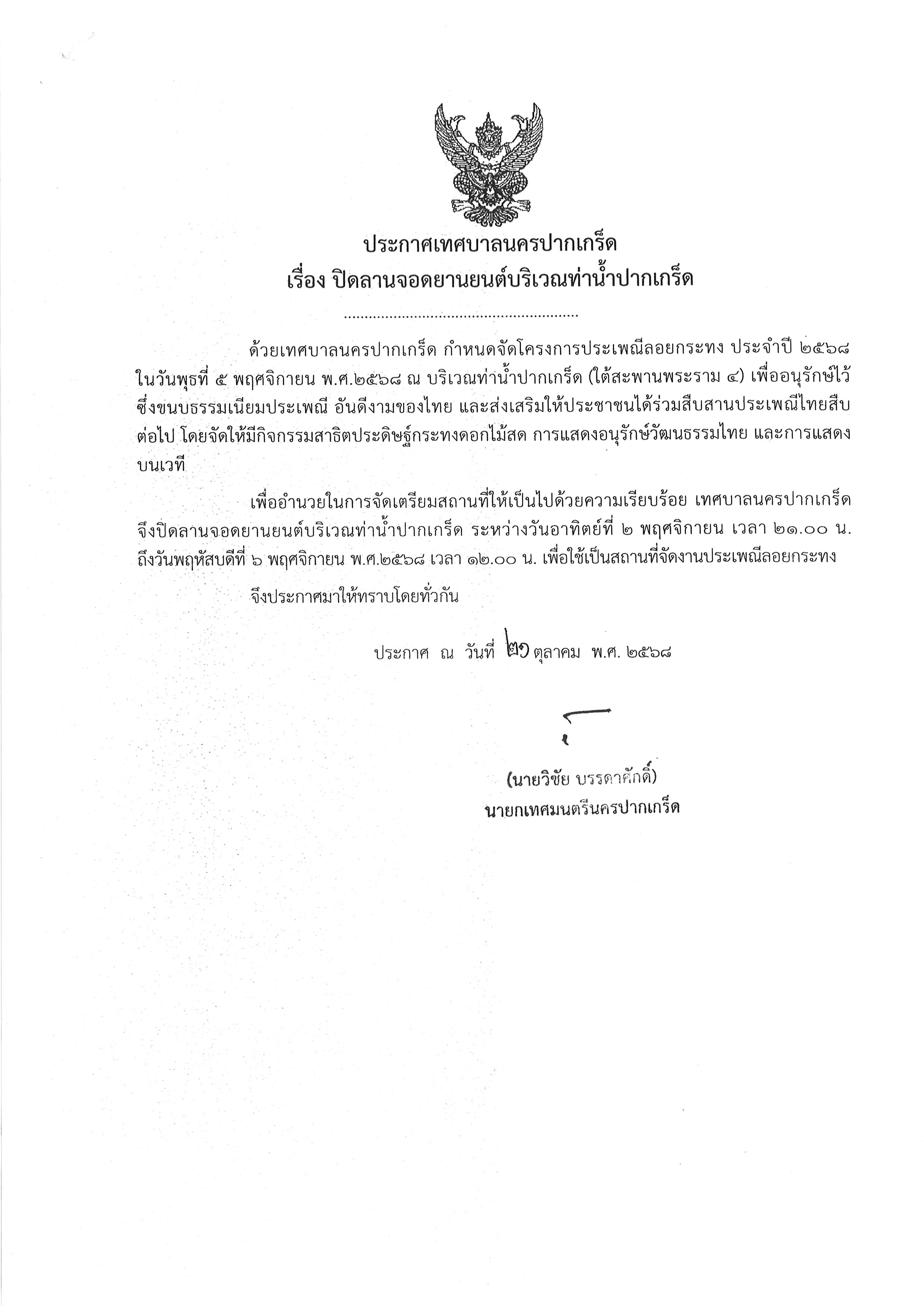ปิดลานจอดยานยนต์บริเวณท่าน้ำปากเกร็ด (จำนวน ๑ ลานจอด) ในวันอาทิตย์ที่ ๒ พฤศจิกายน ๒๕๖๘ ถึง วันพฤหัสบดีที่ ๖ พฤศจิกายน ๒๕๖๘