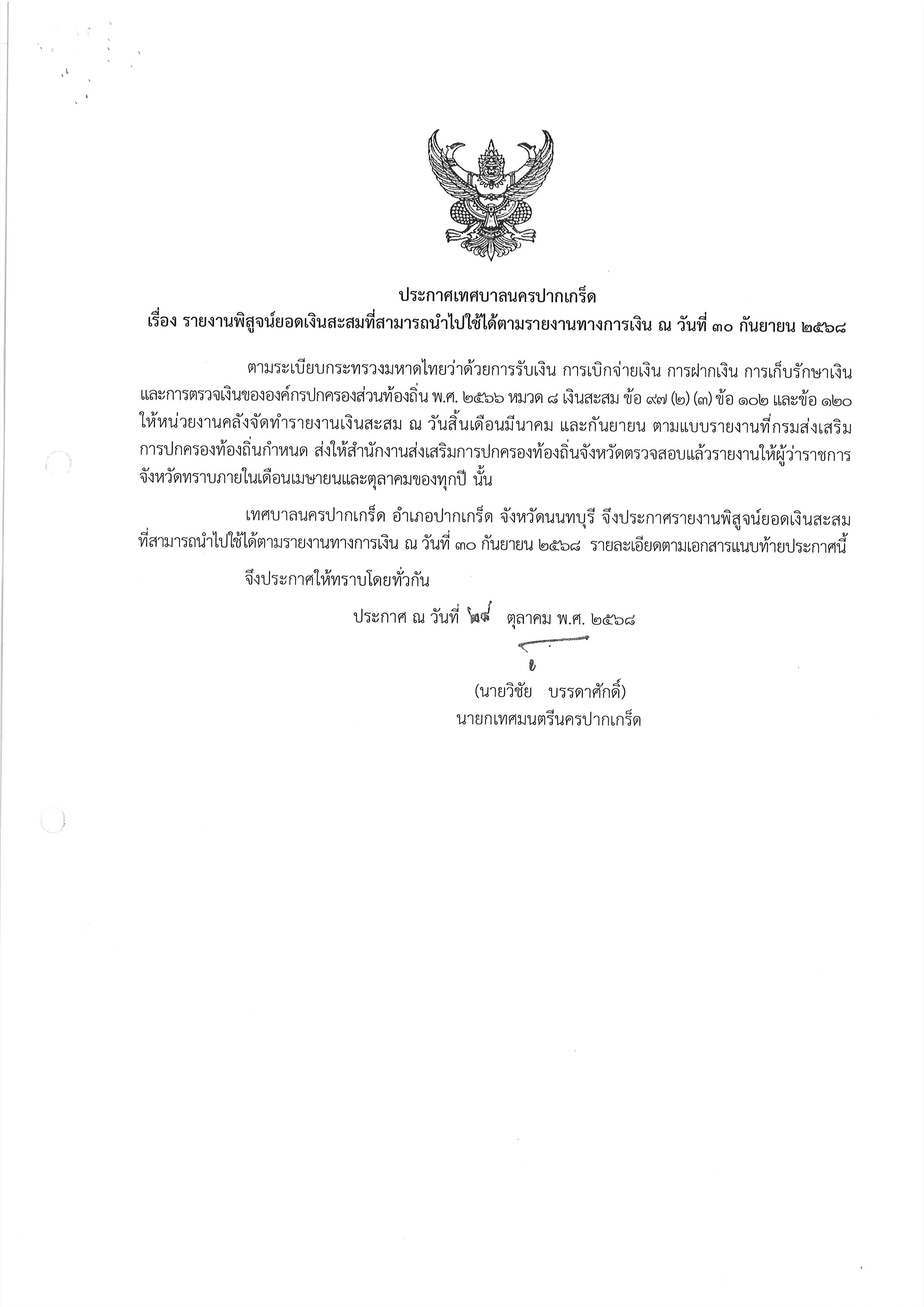 ประกาศเทศบาลนครปากเกร็ด เรื่อง รายงานพิสูจน์ยอดเงินสะสมที่สามารถนำไปใช้ได้ตามรายงานทางการเงิน ณ วันที่ ๓๐ กันยายน ๒๕๖๘