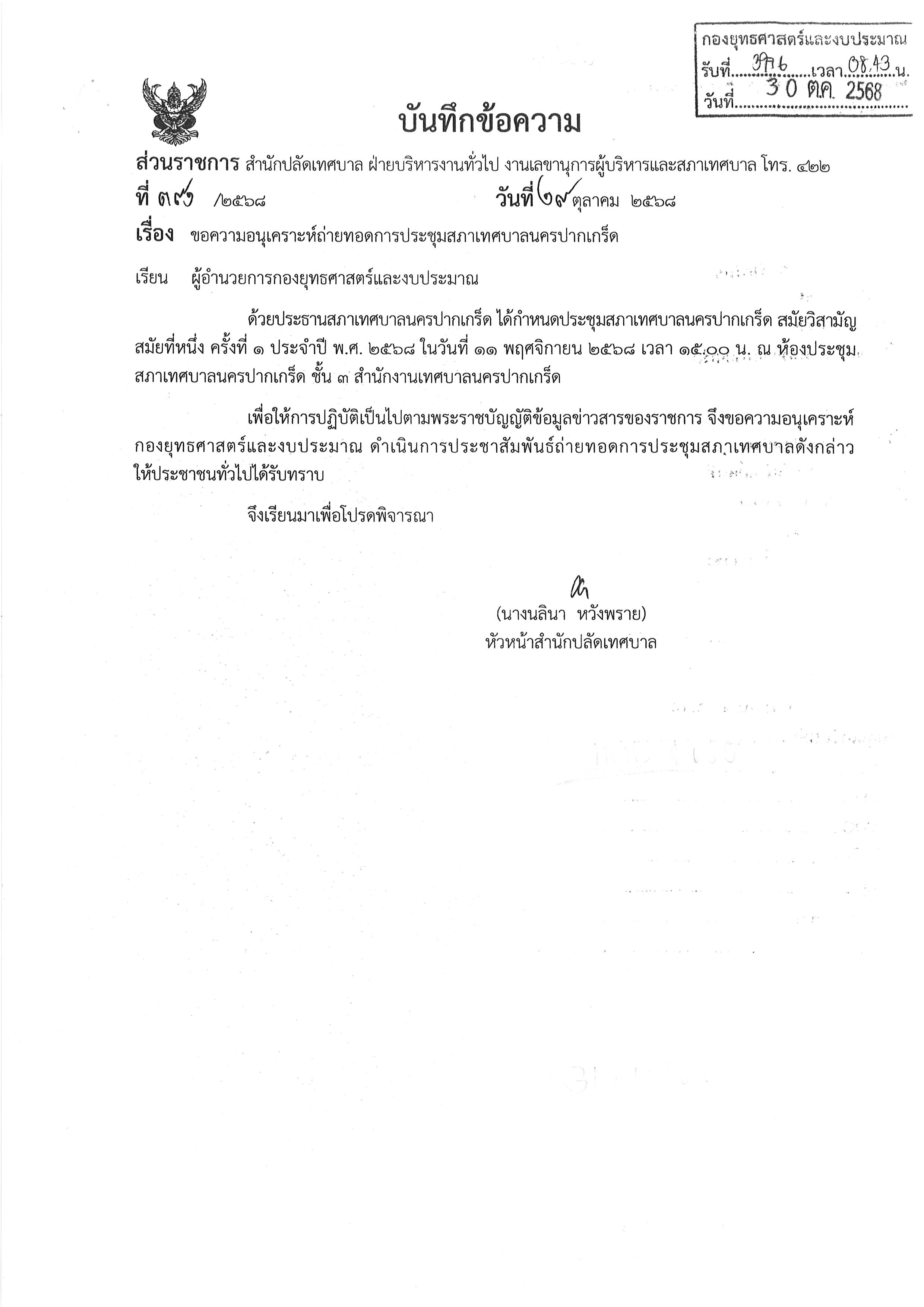 ขอเชิญรับชมและรับฟังการถ่ายทอดสด การประชุมสภาเทศบาลนครปากเกร็ด สมัยวิสามัญ สมัยที่หนึ่ง ครั้งที่ ๑ ประจำปี พ.ศ.๒๕๖๘