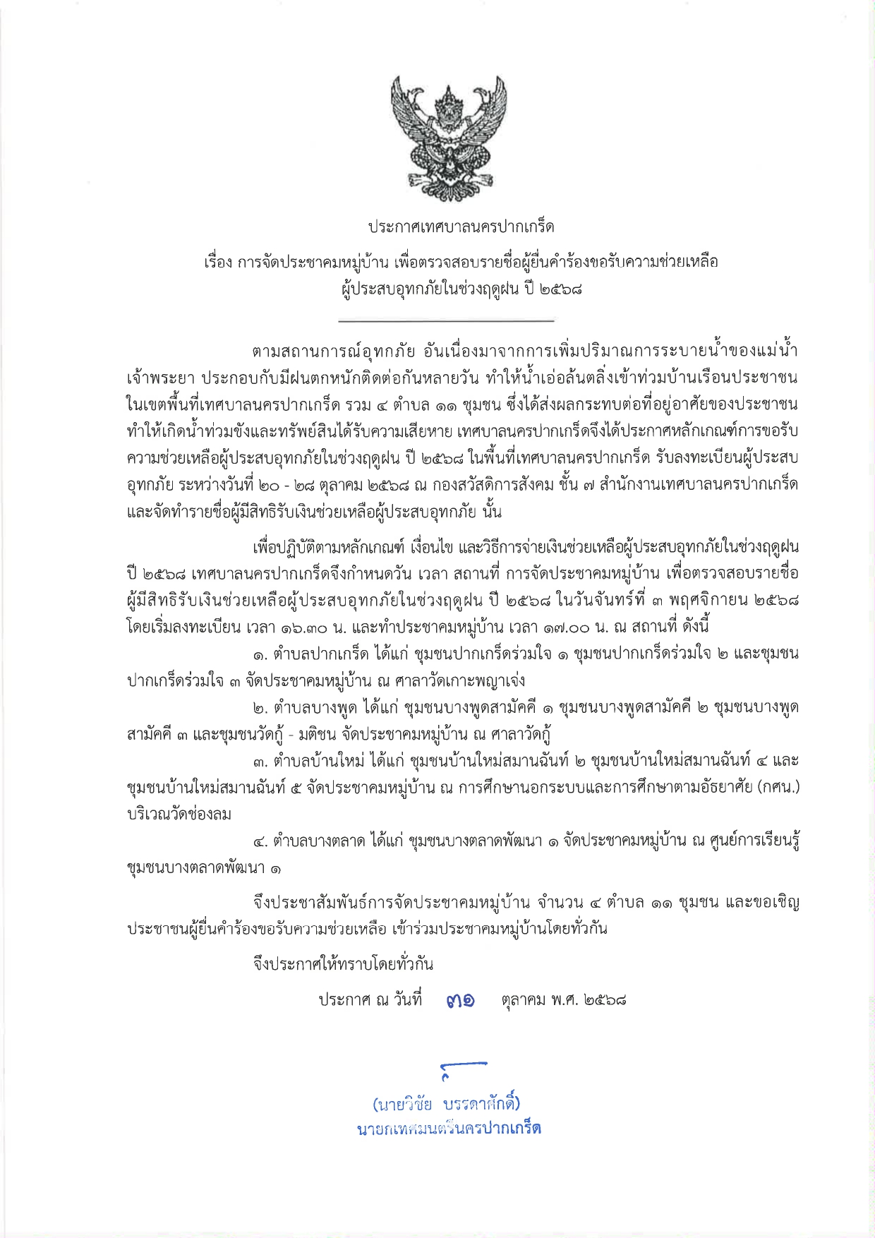 ประกาศเทศบาลนครปากเกร็ด เรื่อง การจัดประชาคมหมู่บ้าน เพื่อตรวจสอบรายชื่อผู้ยื่นคำร้องขอรับความช่วยเหลือผู้ประสบอุทกภัยในช่วงฤดูฝน ปี ๒๕๖๘