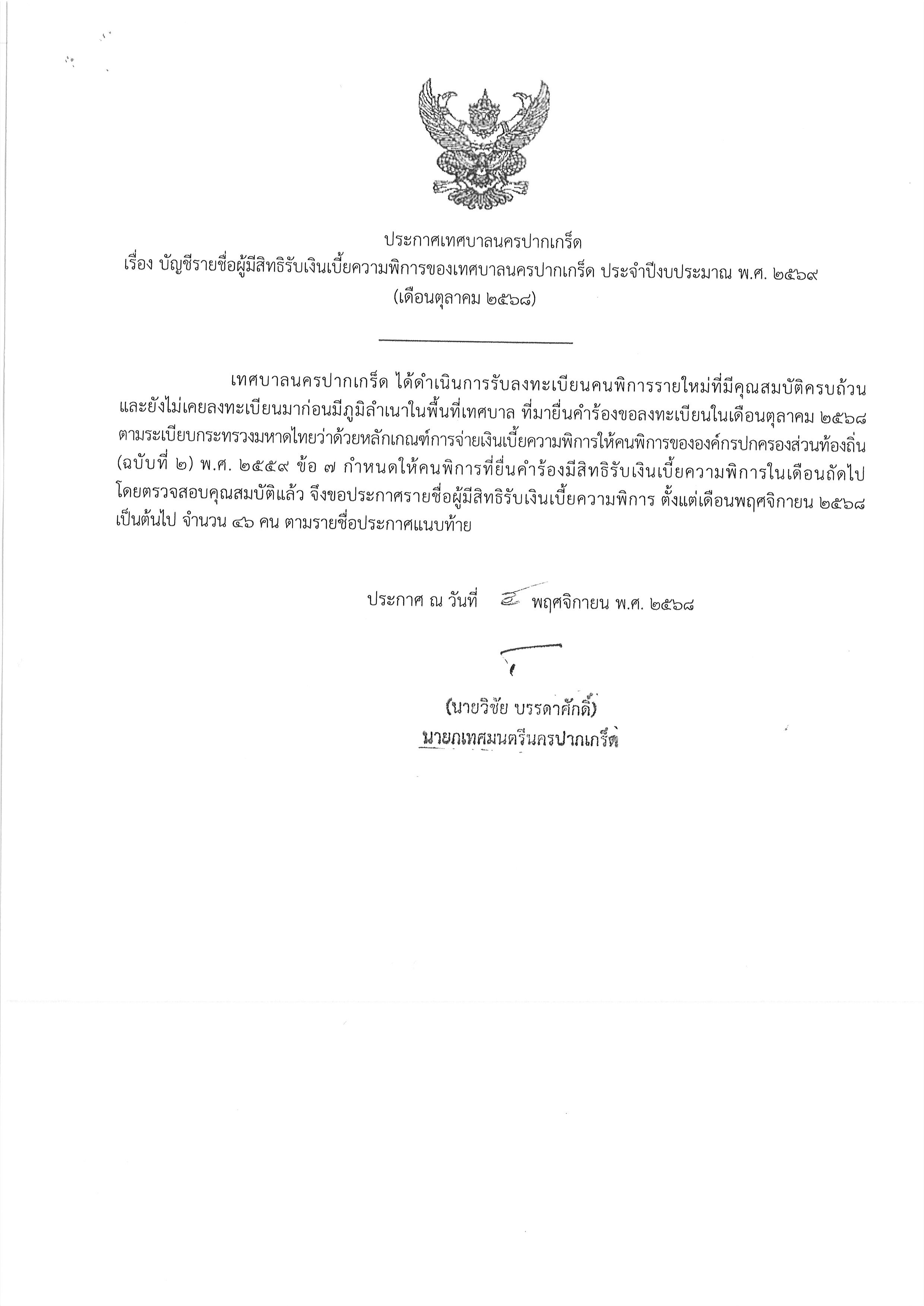 ประกาศเทศบาลนครปากเกร็ด เรื่อง บัญชีรายชื่อผู้มีสิทธิรับเงินเบี้ยความพิการของเทศบาลนครปากเกร็ด ประจำปีงบประมาณ พ.ศ.๒๕๖๙ (เดือนตุลาคม ๒๕๖๘)