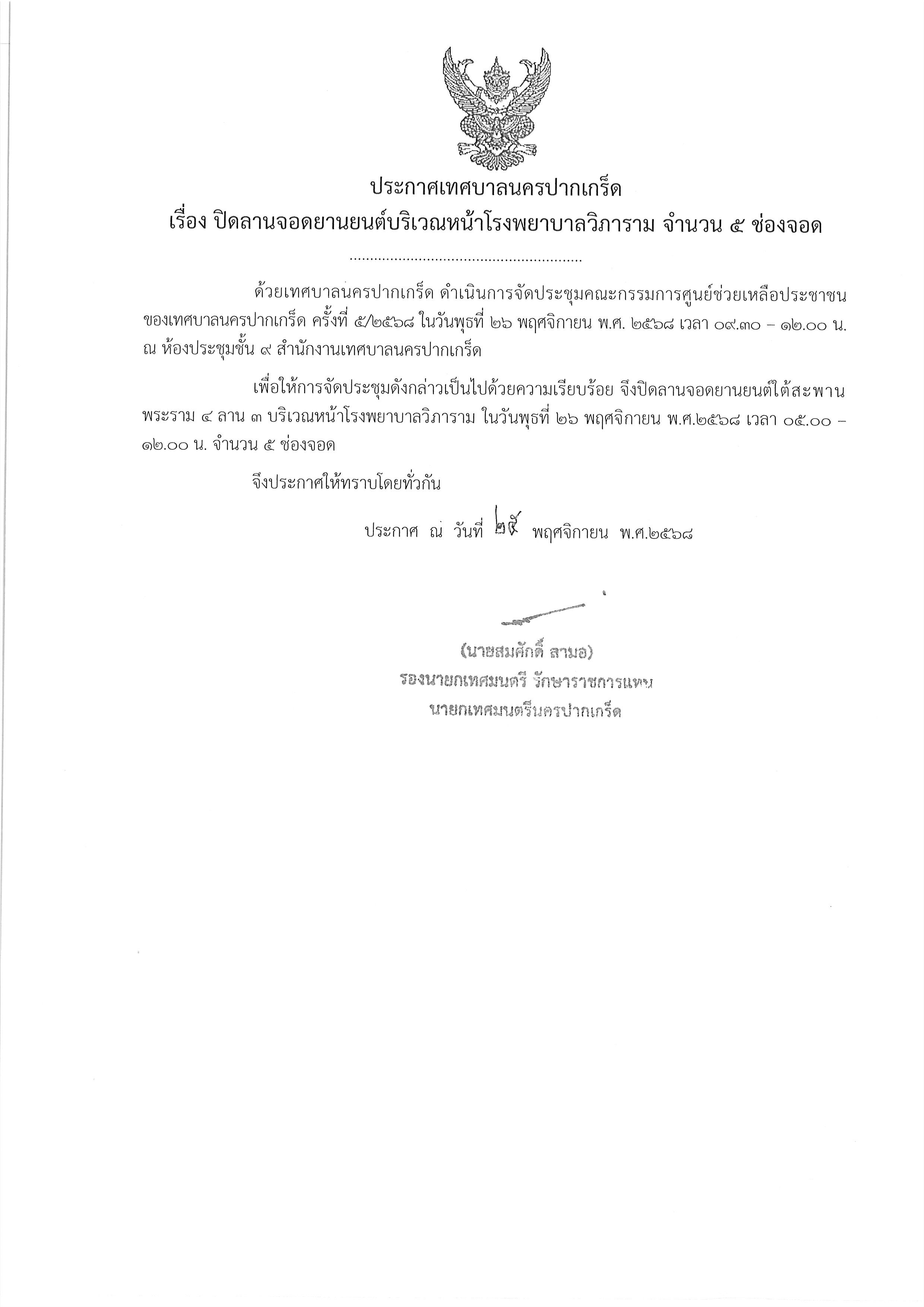 ปิดลานจอดยานยนต์บริเวณหน้าโรงพยาบาลวิภาราม จำนวน ๕ ช่องจอด ในวันที่ ๒๖ พฤศจิกายน ๒๕๖๘