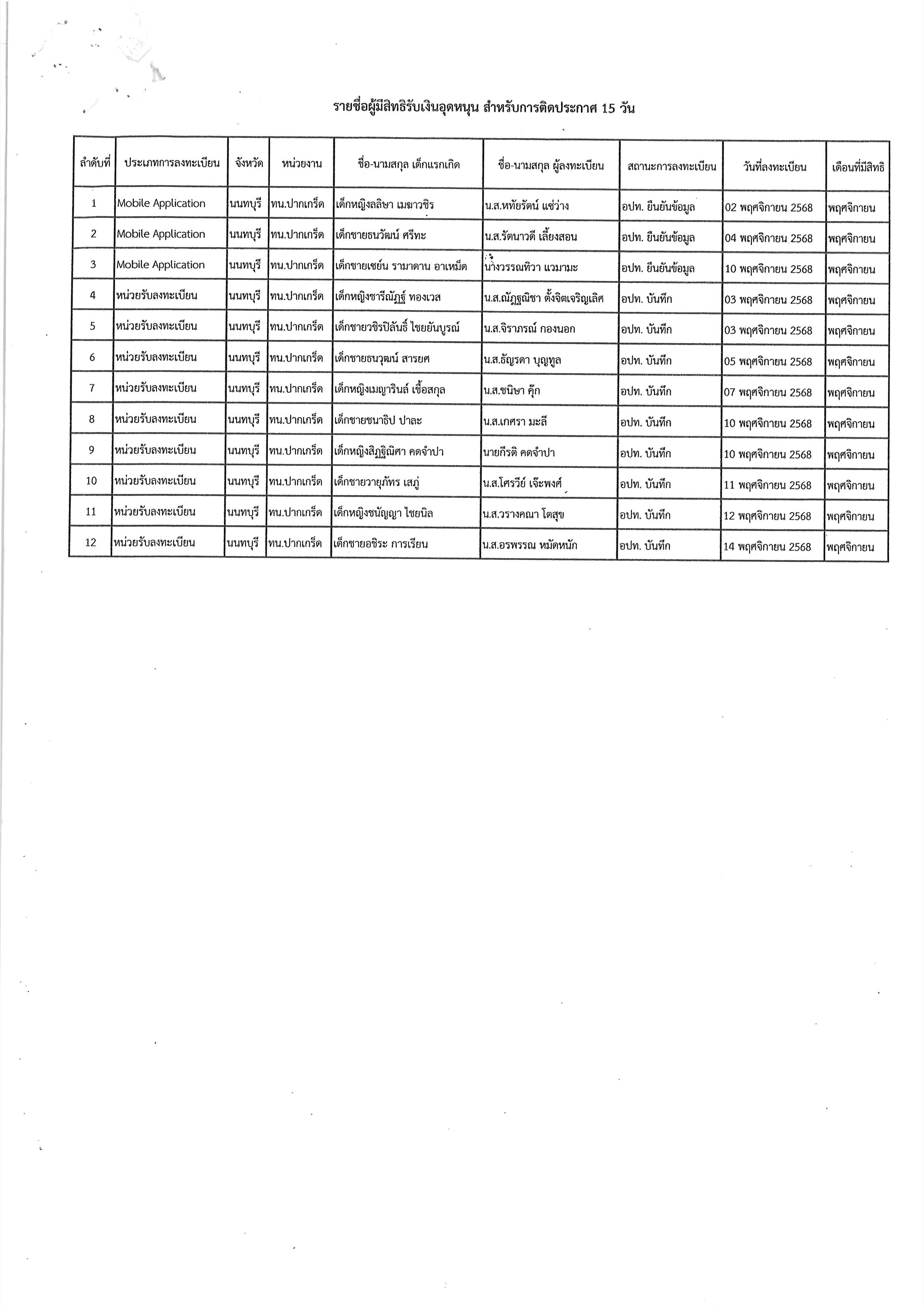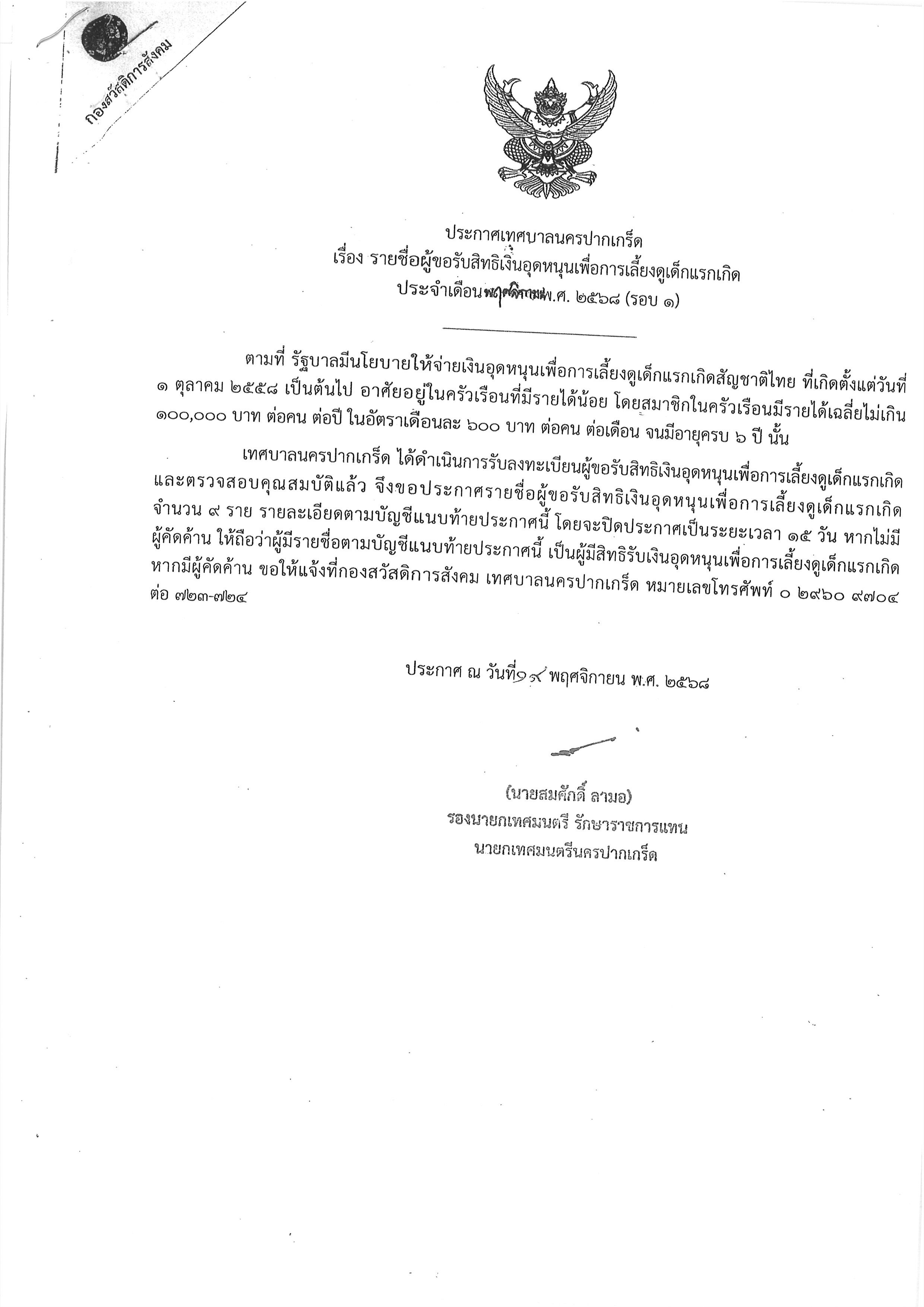 รายชื่อผู้ขอรับสิทธิเงินอุดหนุนเพื่อการเลี้ยงดูเด็กแรกเกิด ประจำเดือนพฤศจิกายน พ.ศ.๒๕๖๘ (รอบ๑)
