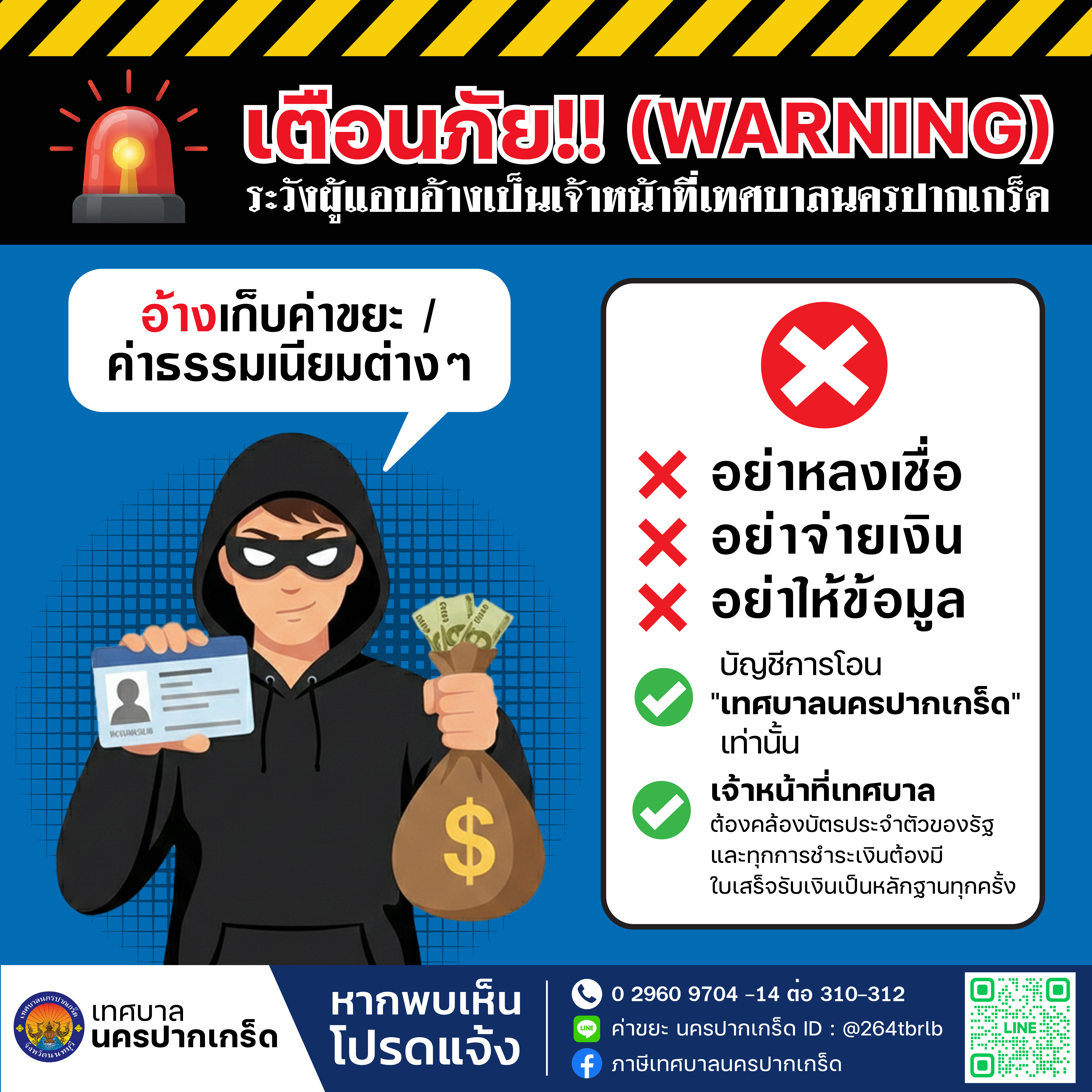 เตือนภัย !! ระวังผู้แอบอ้างเป็นเจ้าหน้าที่เทศบาลนครปากเกร็ด