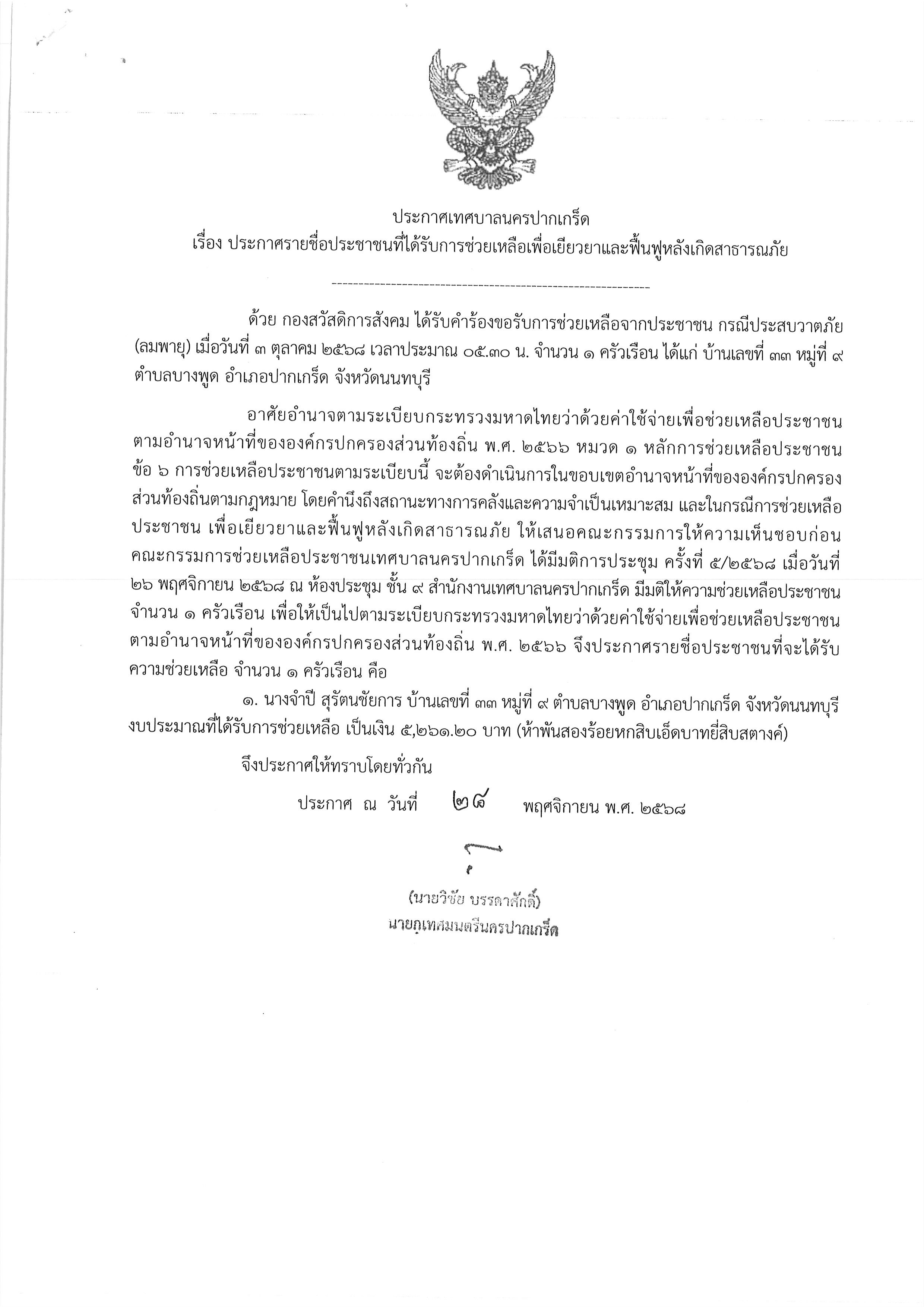 ประกาศเทศบาลนครปากเกร็ด เรื่อง ประกาศรายชื่อประชาชนที่ได้รับการช่วยเหลือเพื่อเยียวยาและฟื้นฟูหลังเกิดสาธารณภัย