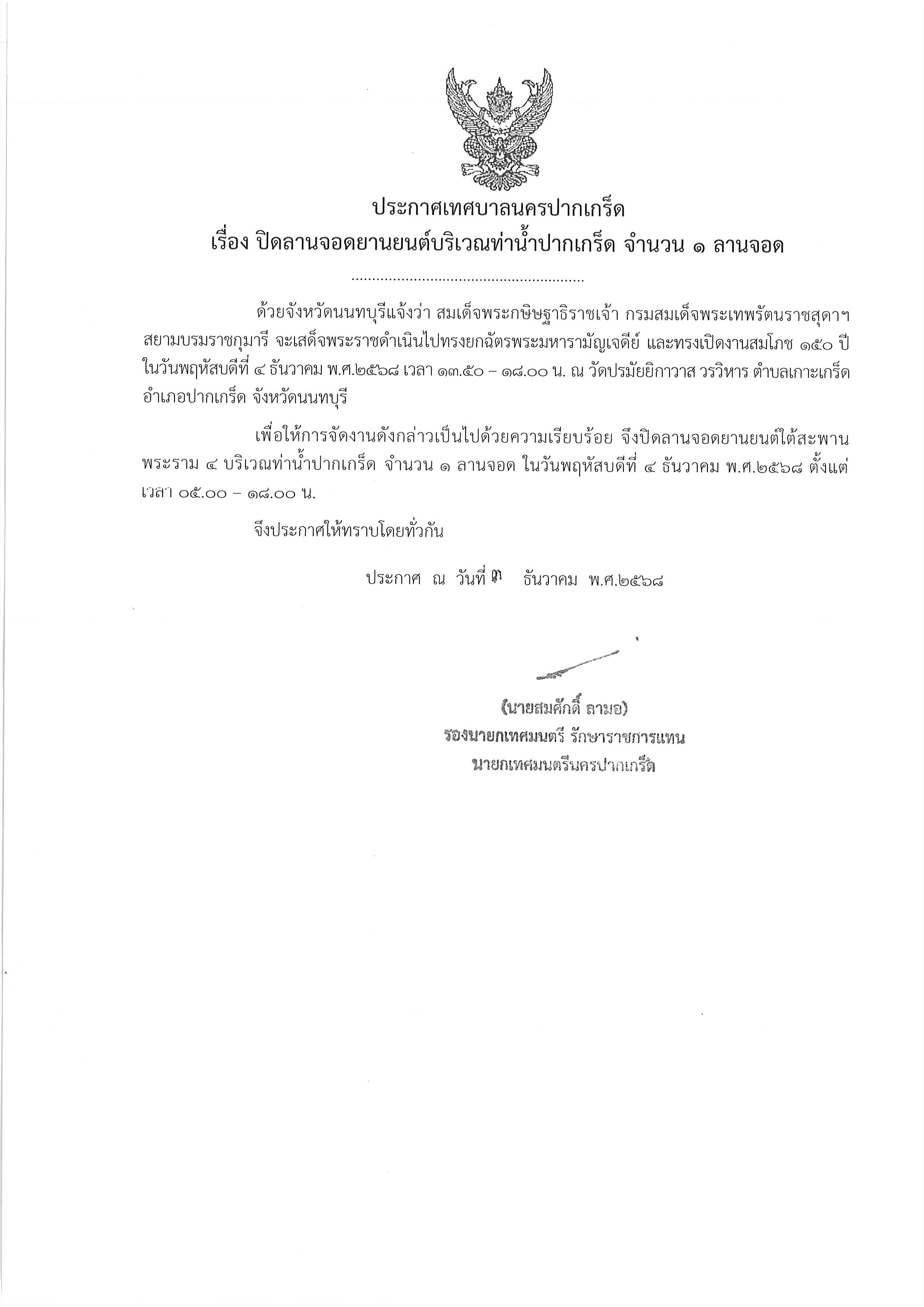 ปิดลานจอดยานยนต์บริเวณท่าน้ำปากเกร็ด จำนวน ๑ ลานจอด ในวันพฤหัสบดีที่ ๔ ธันวาคม ๒๕๖๘
