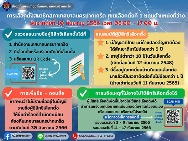 • การรับสมัครรับเลือกตั้งสมาชิกสภาเทศบาลนครปากเกร็ด เขตเลือกตั้งที่ 1 เเทนที่ตำแหน่งว่าง
