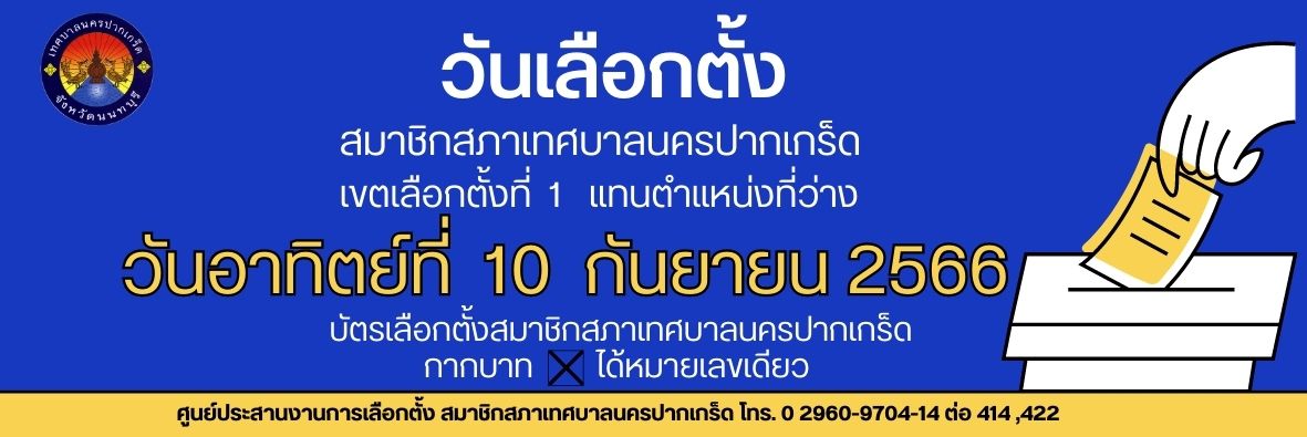 • ประกาศผู้อำนวยการการเลือกตั้งประจำเทศบาลนครปากเกร็ด เรื่อง บัญชีรายชื่อผู้สมัครรับเลือกตั้งสมาชิกสภาเทศบาลนครปากเกร็ดที่ได้รับสมัครเลือกตั้งและไม่ได้รับสมัครเลือกตั้ง เขตเลือกตั้งที่ ๑ แทนตำแหน่งที่ว่าง